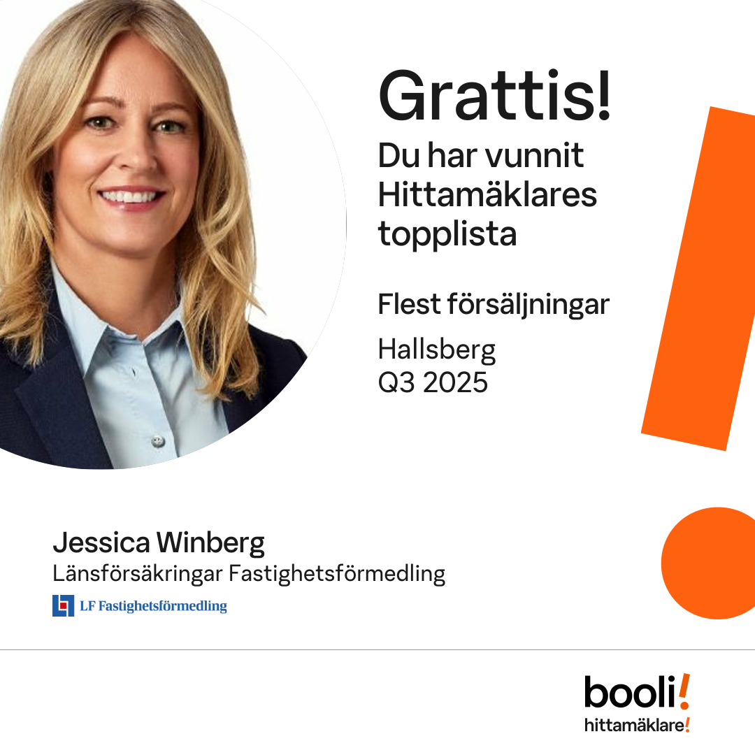 Statistik för publicerade bostäder, försäljningar och omdömen baseras på data från Booli och Hittamäklare. Statistiken för försäljningar avser inrapporterade och verifierade slutpriser från mäklare eller av Booli inhämtade och verifierade slutpriser. Statistiken för publicerade bostäder baseras på information som publicerats på Booli.se. Statistik för omdömen och rekommendationer baseras på omdömen från säljare som lämnats via Booli och Hittamäklare.