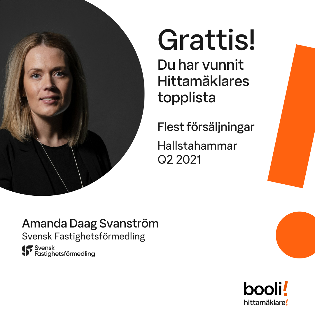 Statistik för publicerade bostäder, försäljningar och omdömen baseras på data från Booli och Hittamäklare. Statistiken för försäljningar avser inrapporterade och verifierade slutpriser från mäklare eller av Booli inhämtade och verifierade slutpriser. Statistiken för publicerade bostäder baseras på information som publicerats på Booli.se. Statistik för omdömen och rekommendationer baseras på omdömen från säljare som lämnats via Booli och Hittamäklare.