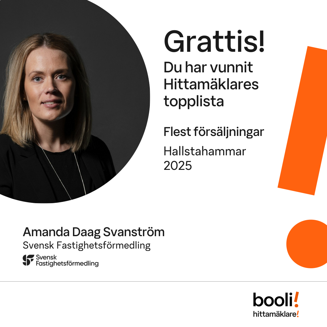 Statistik för publicerade bostäder, försäljningar och omdömen baseras på data från Booli och Hittamäklare. Statistiken för försäljningar avser inrapporterade och verifierade slutpriser från mäklare eller av Booli inhämtade och verifierade slutpriser. Statistiken för publicerade bostäder baseras på information som publicerats på Booli.se. Statistik för omdömen och rekommendationer baseras på omdömen från säljare som lämnats via Booli och Hittamäklare.