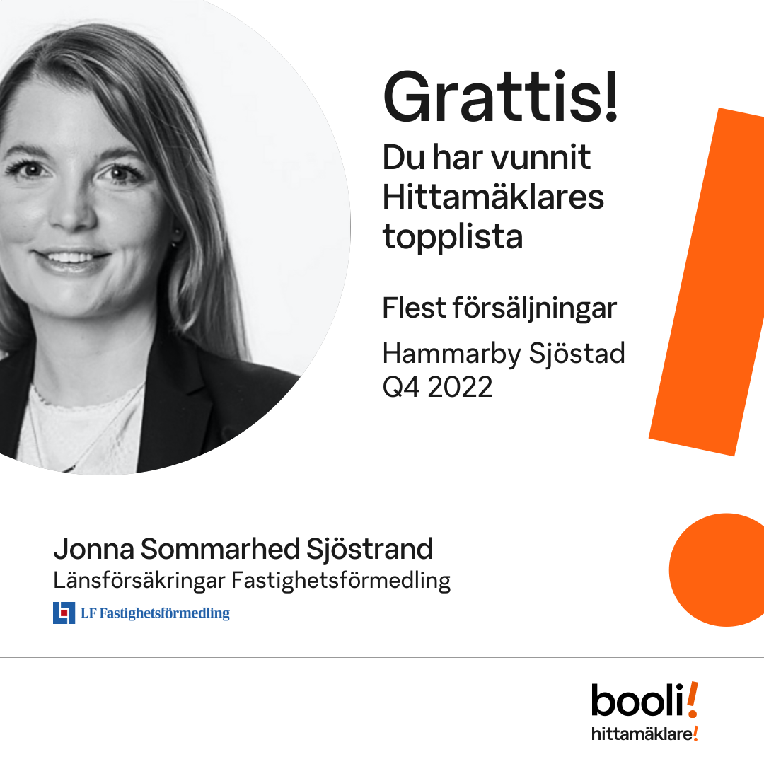Statistik för publicerade bostäder, försäljningar och omdömen baseras på data från Booli och Hittamäklare. Statistiken för försäljningar avser inrapporterade och verifierade slutpriser från mäklare eller av Booli inhämtade och verifierade slutpriser. Statistiken för publicerade bostäder baseras på information som publicerats på Booli.se. Statistik för omdömen och rekommendationer baseras på omdömen från säljare som lämnats via Booli och Hittamäklare.