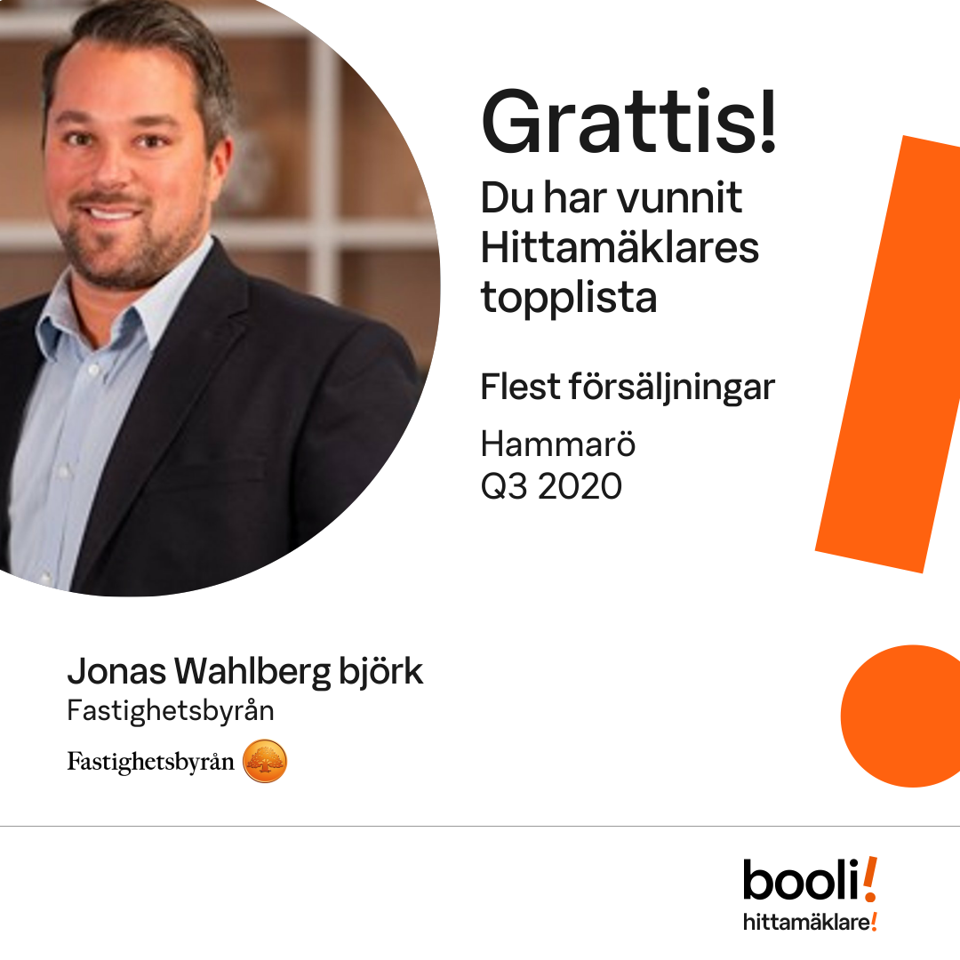 Statistik för publicerade bostäder, försäljningar och omdömen baseras på data från Booli och Hittamäklare. Statistiken för försäljningar avser inrapporterade och verifierade slutpriser från mäklare eller av Booli inhämtade och verifierade slutpriser. Statistiken för publicerade bostäder baseras på information som publicerats på Booli.se. Statistik för omdömen och rekommendationer baseras på omdömen från säljare som lämnats via Booli och Hittamäklare.