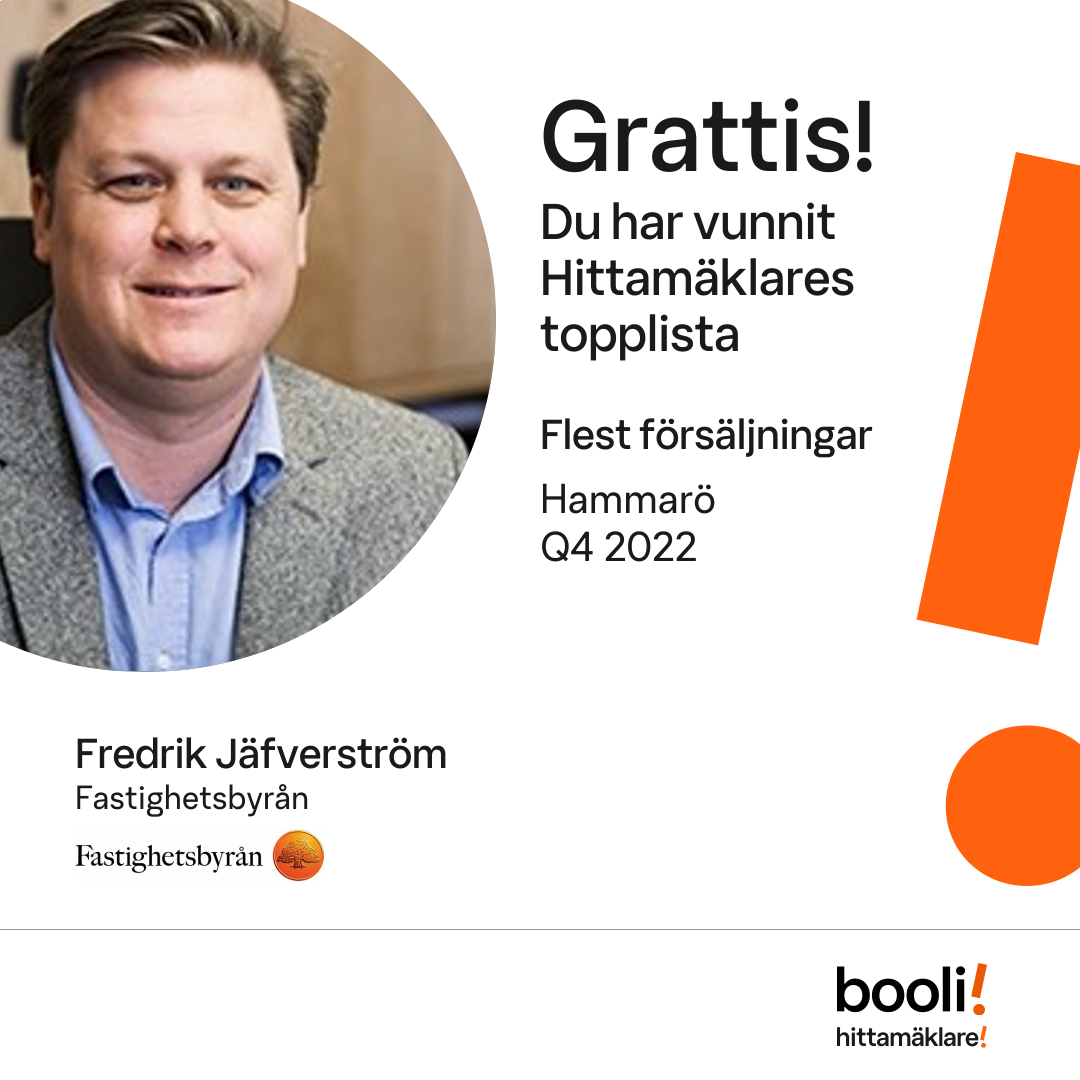 Statistik för publicerade bostäder, försäljningar och omdömen baseras på data från Booli och Hittamäklare. Statistiken för försäljningar avser inrapporterade och verifierade slutpriser från mäklare eller av Booli inhämtade och verifierade slutpriser. Statistiken för publicerade bostäder baseras på information som publicerats på Booli.se. Statistik för omdömen och rekommendationer baseras på omdömen från säljare som lämnats via Booli och Hittamäklare.