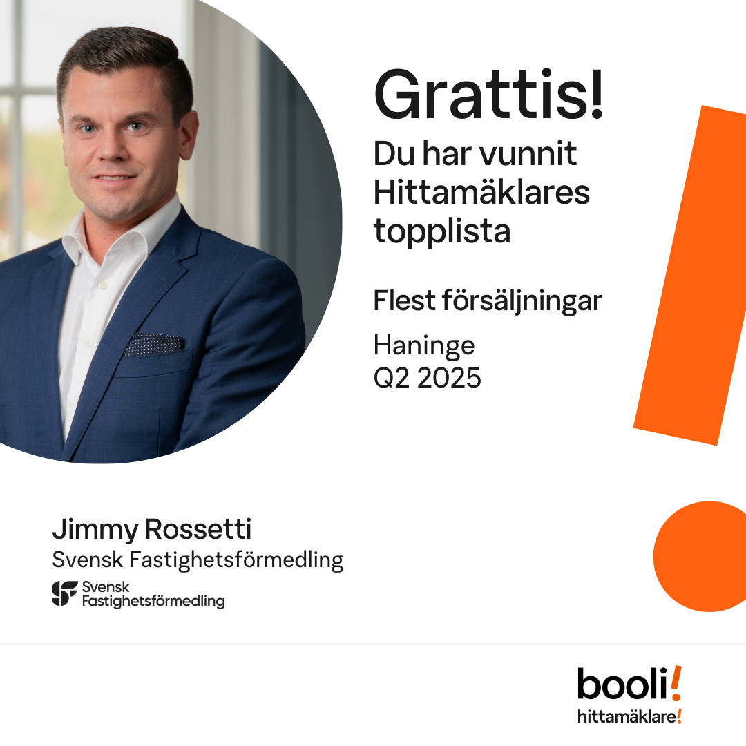 Statistik för publicerade bostäder, försäljningar och omdömen baseras på data från Booli och Hittamäklare. Statistiken för försäljningar avser inrapporterade och verifierade slutpriser från mäklare eller av Booli inhämtade och verifierade slutpriser. Statistiken för publicerade bostäder baseras på information som publicerats på Booli.se. Statistik för omdömen och rekommendationer baseras på omdömen från säljare som lämnats via Booli och Hittamäklare.