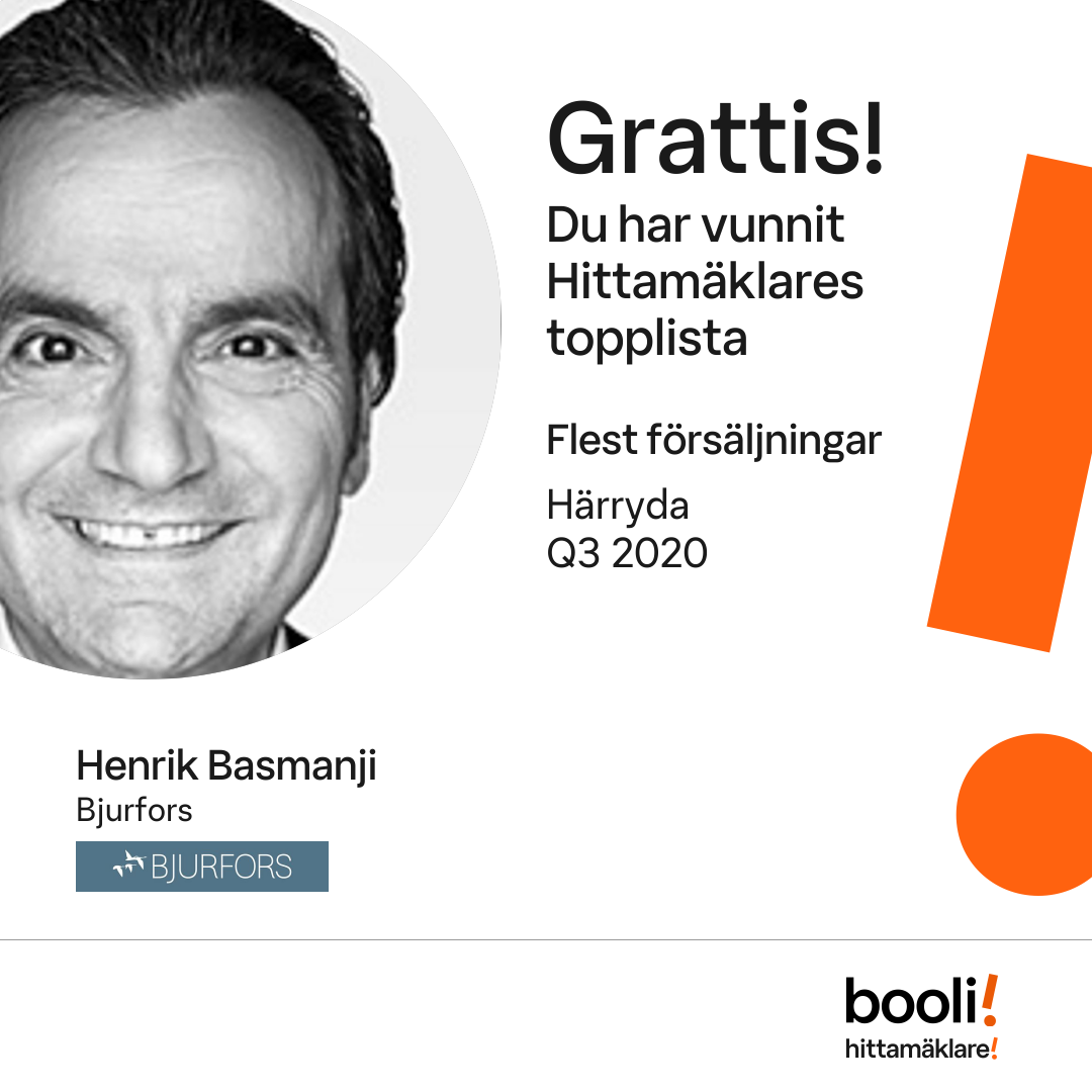 Statistik för publicerade bostäder, försäljningar och omdömen baseras på data från Booli och Hittamäklare. Statistiken för försäljningar avser inrapporterade och verifierade slutpriser från mäklare eller av Booli inhämtade och verifierade slutpriser. Statistiken för publicerade bostäder baseras på information som publicerats på Booli.se. Statistik för omdömen och rekommendationer baseras på omdömen från säljare som lämnats via Booli och Hittamäklare.