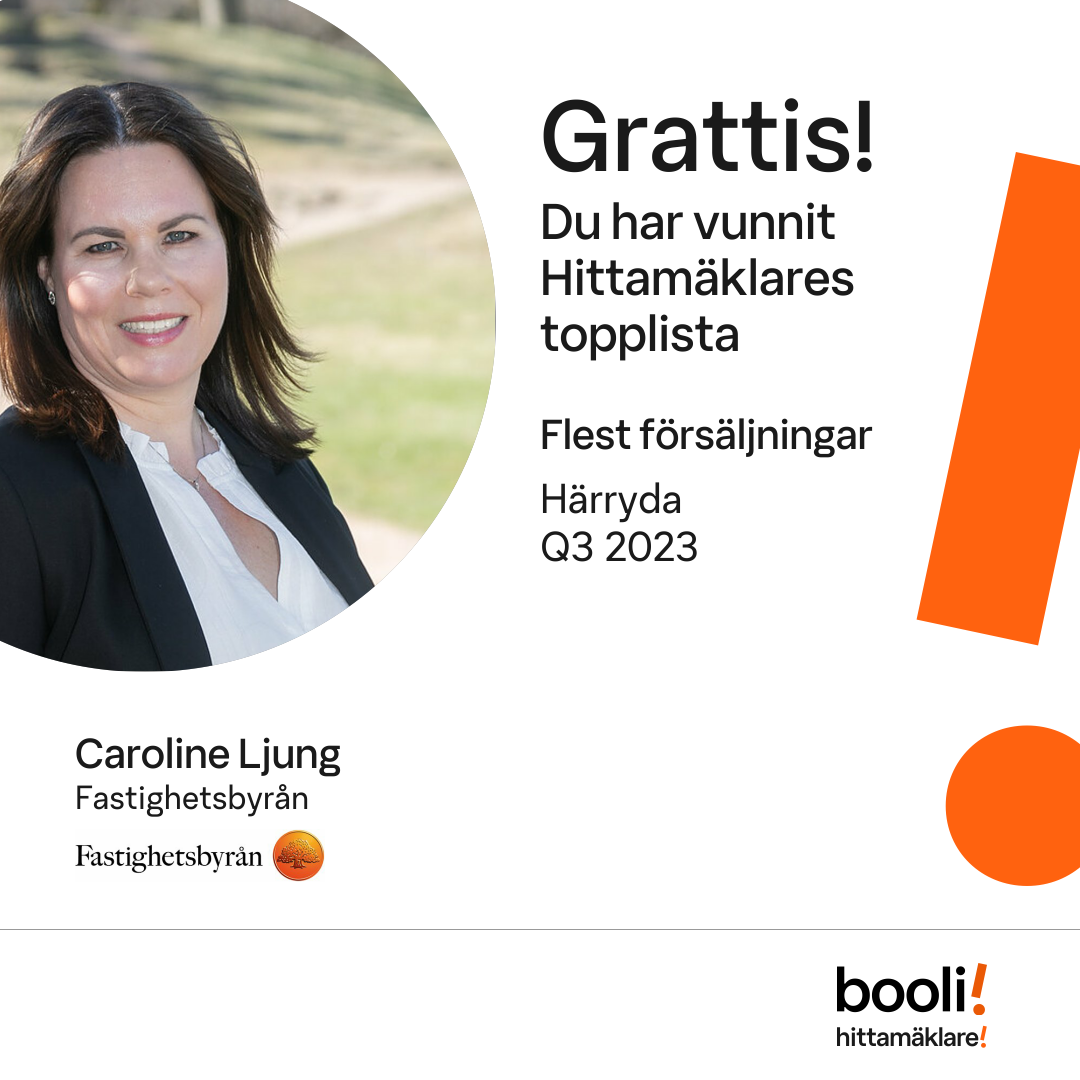 Statistik för publicerade bostäder, försäljningar och omdömen baseras på data från Booli och Hittamäklare. Statistiken för försäljningar avser inrapporterade och verifierade slutpriser från mäklare eller av Booli inhämtade och verifierade slutpriser. Statistiken för publicerade bostäder baseras på information som publicerats på Booli.se. Statistik för omdömen och rekommendationer baseras på omdömen från säljare som lämnats via Booli och Hittamäklare.