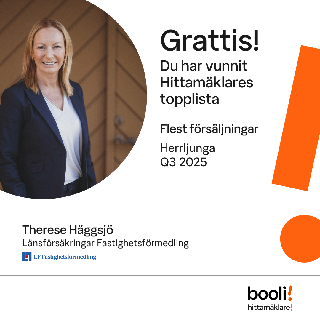Statistik för publicerade bostäder, försäljningar och omdömen baseras på data från Booli och Hittamäklare. Statistiken för försäljningar avser inrapporterade och verifierade slutpriser från mäklare eller av Booli inhämtade och verifierade slutpriser. Statistiken för publicerade bostäder baseras på information som publicerats på Booli.se. Statistik för omdömen och rekommendationer baseras på omdömen från säljare som lämnats via Booli och Hittamäklare.