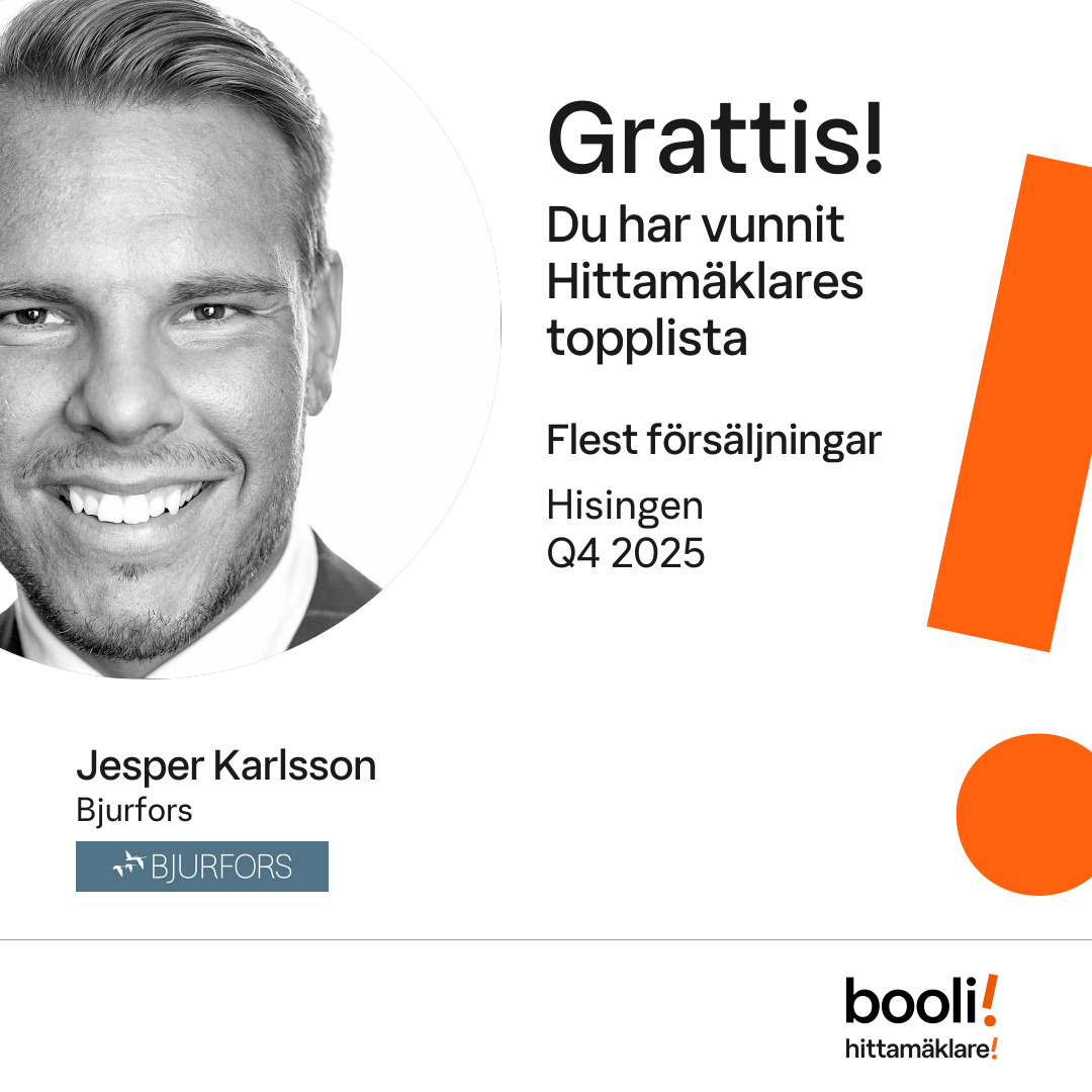 Statistik för publicerade bostäder, försäljningar och omdömen baseras på data från Booli och Hittamäklare. Statistiken för försäljningar avser inrapporterade och verifierade slutpriser från mäklare eller av Booli inhämtade och verifierade slutpriser. Statistiken för publicerade bostäder baseras på information som publicerats på Booli.se. Statistik för omdömen och rekommendationer baseras på omdömen från säljare som lämnats via Booli och Hittamäklare.