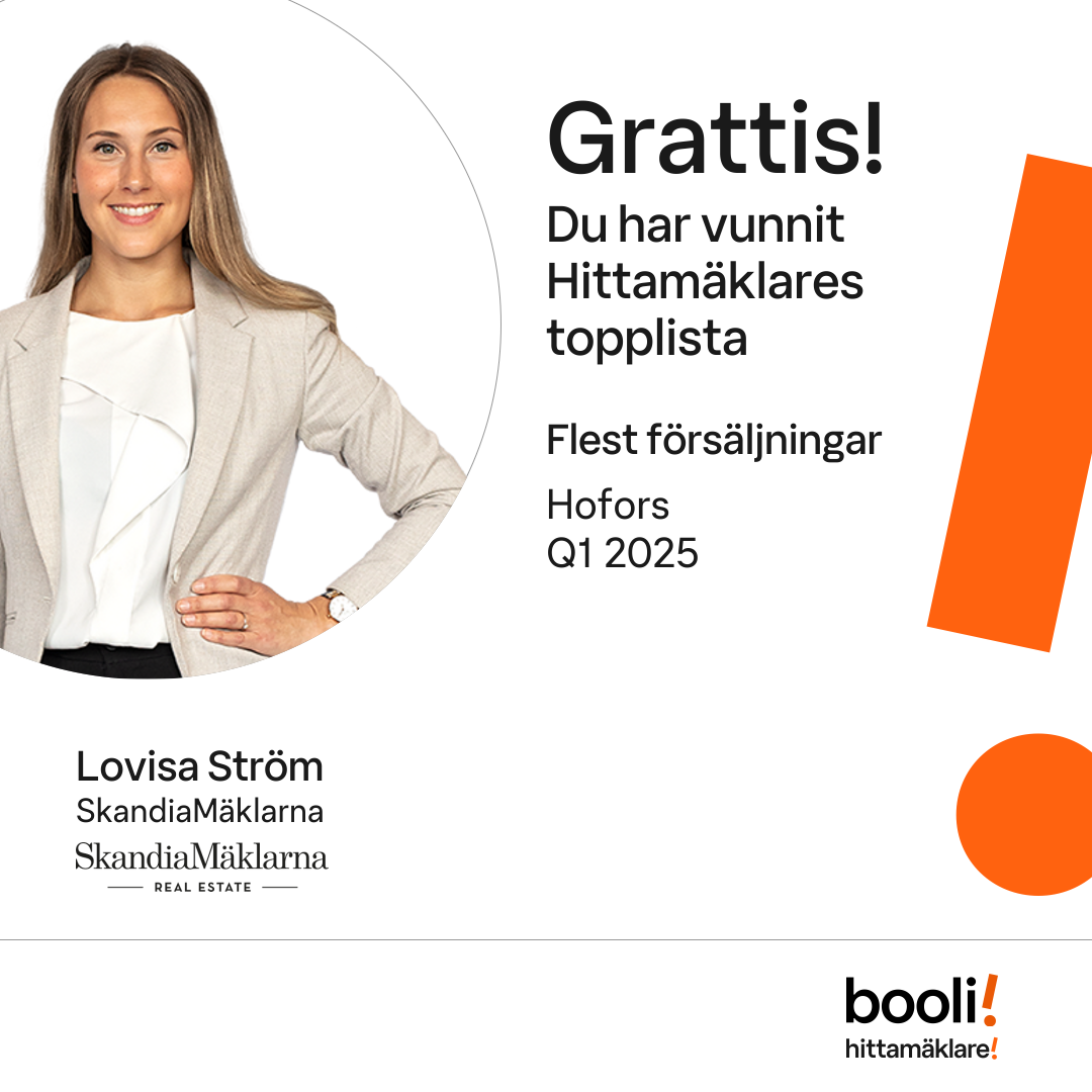 Statistik för publicerade bostäder, försäljningar och omdömen baseras på data från Booli och Hittamäklare. Statistiken för försäljningar avser inrapporterade och verifierade slutpriser från mäklare eller av Booli inhämtade och verifierade slutpriser. Statistiken för publicerade bostäder baseras på information som publicerats på Booli.se. Statistik för omdömen och rekommendationer baseras på omdömen från säljare som lämnats via Booli och Hittamäklare.