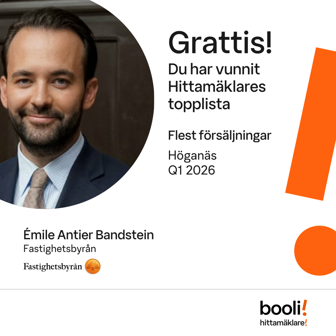 Statistik för publicerade bostäder, försäljningar och omdömen baseras på data från Booli. Statistiken för försäljningar avser inrapporterade och verifierade slutpriser från mäklare eller av Booli inhämtade och verifierade slutpriser. Statistiken för publicerade bostäder baseras på information som publicerats på Booli.se. Statistik för omdömen och rekommendationer baseras på omdömen från säljare som lämnats via Booli.