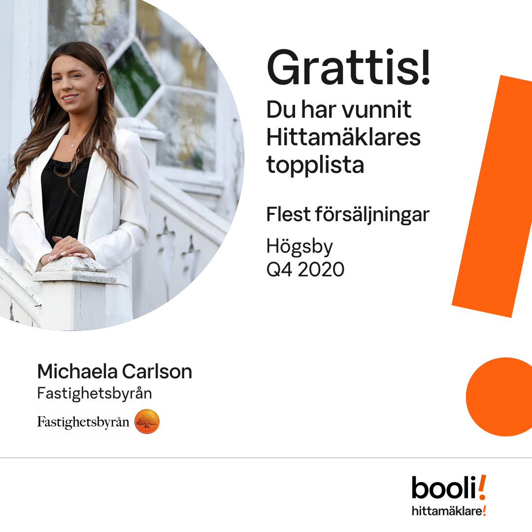 Statistik för publicerade bostäder, försäljningar och omdömen baseras på data från Booli. Statistiken för försäljningar avser inrapporterade och verifierade slutpriser från mäklare eller av Booli inhämtade och verifierade slutpriser. Statistiken för publicerade bostäder baseras på information som publicerats på Booli.se. Statistik för omdömen och rekommendationer baseras på omdömen från säljare som lämnats via Booli.