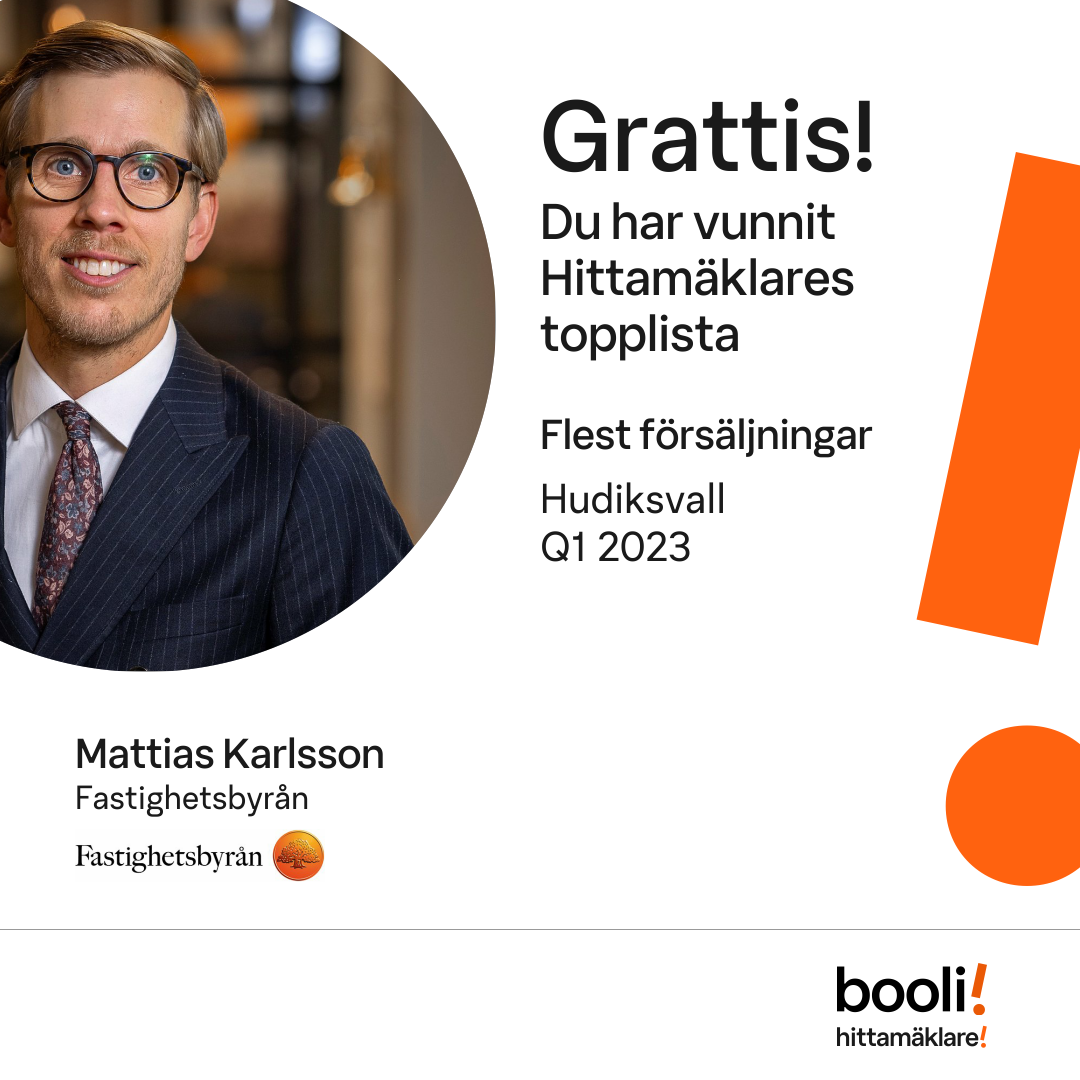 Statistik för publicerade bostäder, försäljningar och omdömen baseras på data från Booli. Statistiken för försäljningar avser inrapporterade och verifierade slutpriser från mäklare eller av Booli inhämtade och verifierade slutpriser. Statistiken för publicerade bostäder baseras på information som publicerats på Booli.se. Statistik för omdömen och rekommendationer baseras på omdömen från säljare som lämnats via Booli.