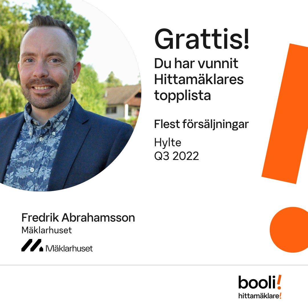 Statistik för publicerade bostäder, försäljningar och omdömen baseras på data från Booli och Hittamäklare. Statistiken för försäljningar avser inrapporterade och verifierade slutpriser från mäklare eller av Booli inhämtade och verifierade slutpriser. Statistiken för publicerade bostäder baseras på information som publicerats på Booli.se. Statistik för omdömen och rekommendationer baseras på omdömen från säljare som lämnats via Booli och Hittamäklare.