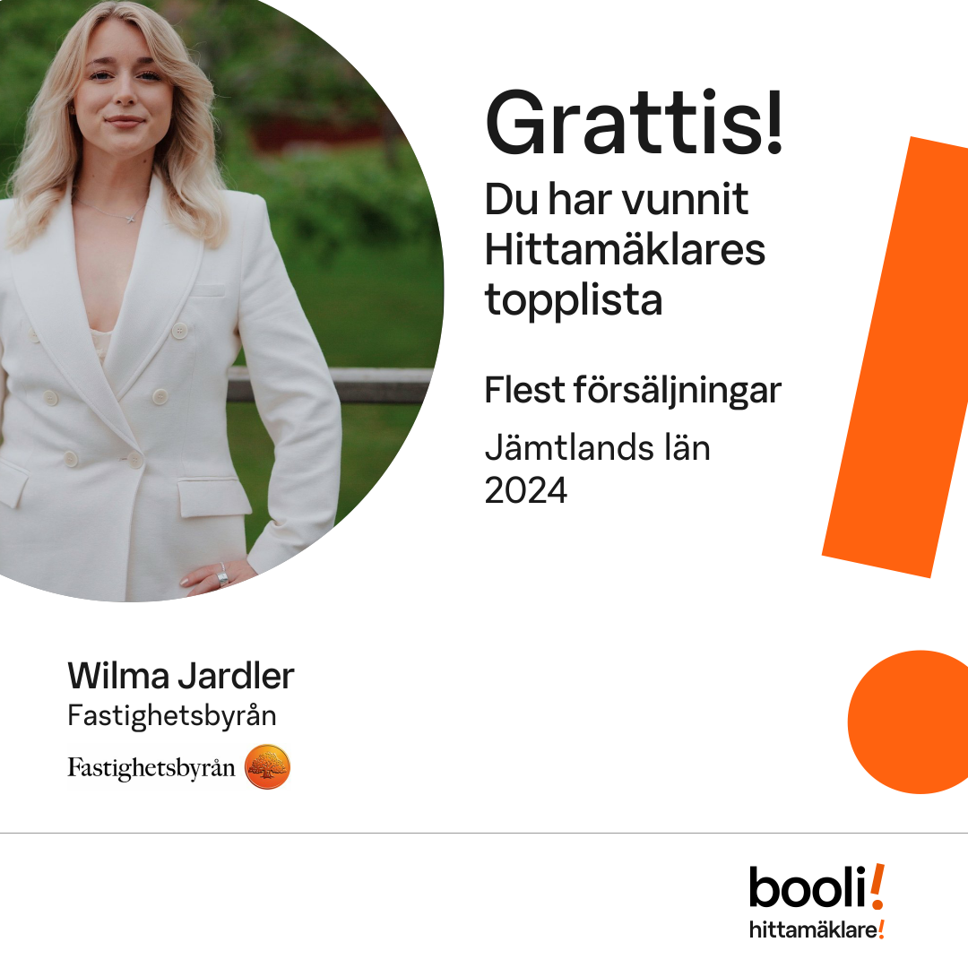 Statistik för publicerade bostäder, försäljningar och omdömen baseras på data från Booli och Hittamäklare. Statistiken för försäljningar avser inrapporterade och verifierade slutpriser från mäklare eller av Booli inhämtade och verifierade slutpriser. Statistiken för publicerade bostäder baseras på information som publicerats på Booli.se. Statistik för omdömen och rekommendationer baseras på omdömen från säljare som lämnats via Booli och Hittamäklare.