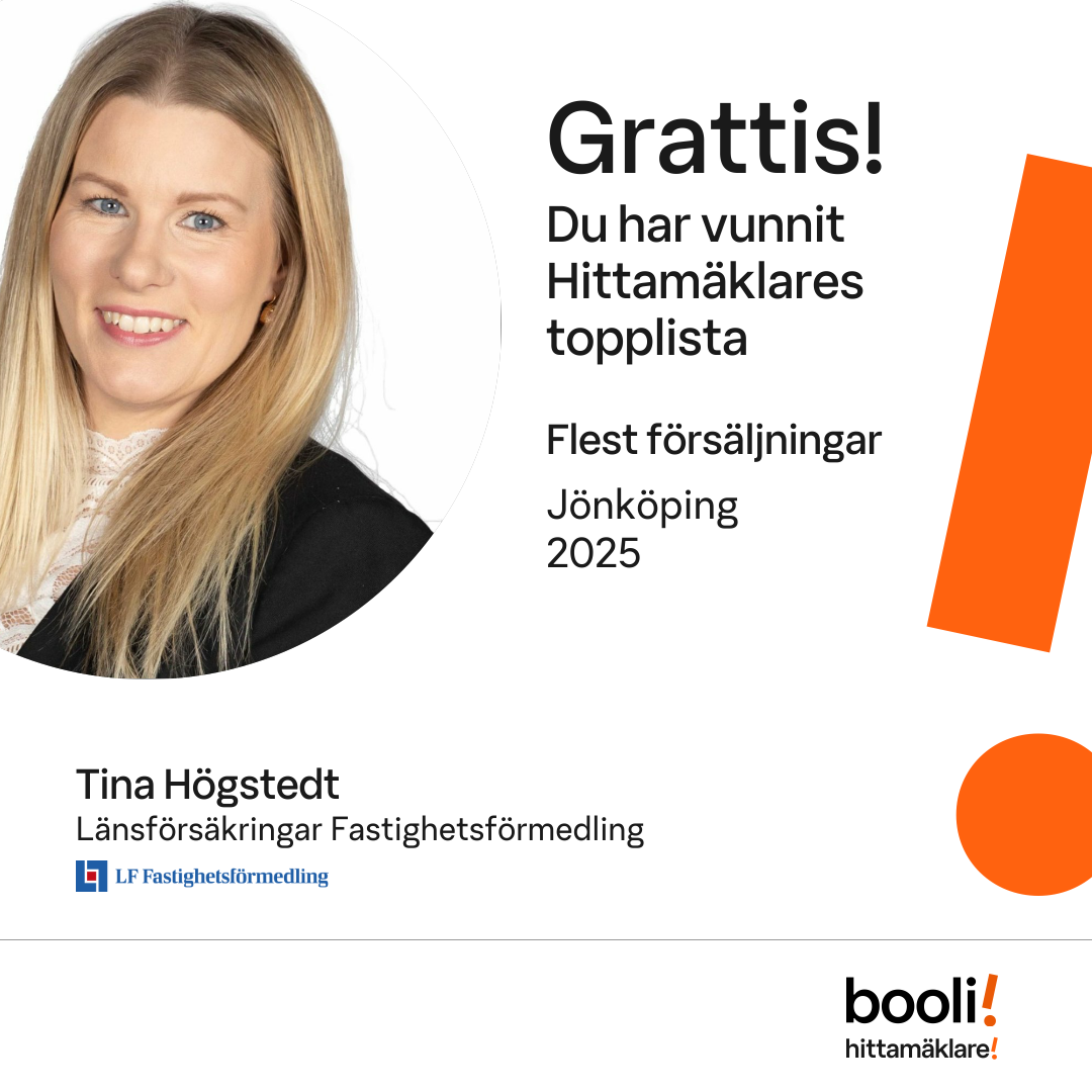 Statistik för publicerade bostäder, försäljningar och omdömen baseras på data från Booli och Hittamäklare. Statistiken för försäljningar avser inrapporterade och verifierade slutpriser från mäklare eller av Booli inhämtade och verifierade slutpriser. Statistiken för publicerade bostäder baseras på information som publicerats på Booli.se. Statistik för omdömen och rekommendationer baseras på omdömen från säljare som lämnats via Booli och Hittamäklare.