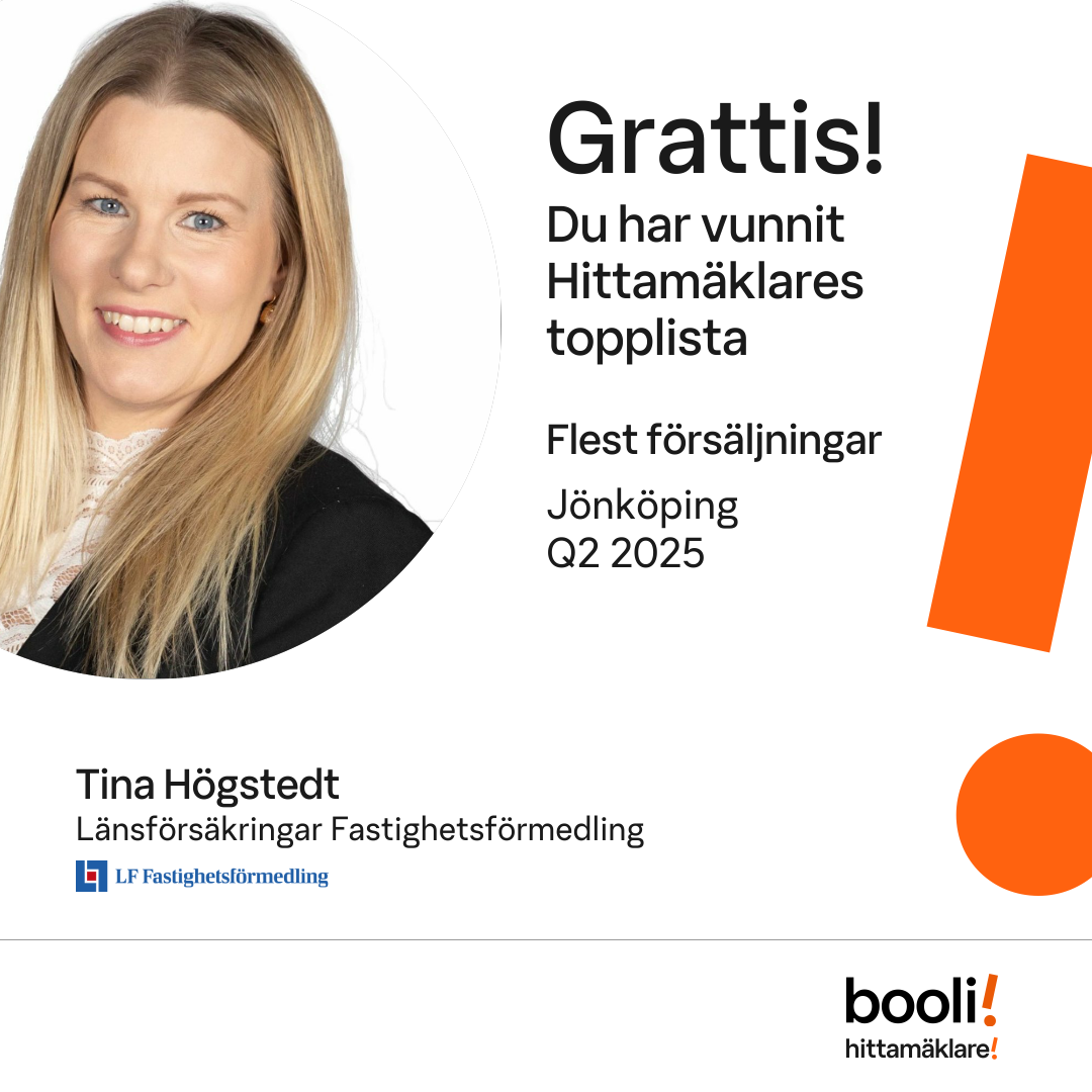 Statistik för publicerade bostäder, försäljningar och omdömen baseras på data från Booli och Hittamäklare. Statistiken för försäljningar avser inrapporterade och verifierade slutpriser från mäklare eller av Booli inhämtade och verifierade slutpriser. Statistiken för publicerade bostäder baseras på information som publicerats på Booli.se. Statistik för omdömen och rekommendationer baseras på omdömen från säljare som lämnats via Booli och Hittamäklare.