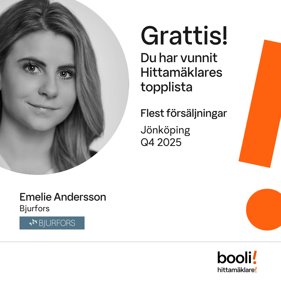 Statistik för publicerade bostäder, försäljningar och omdömen baseras på data från Booli och Hittamäklare. Statistiken för försäljningar avser inrapporterade och verifierade slutpriser från mäklare eller av Booli inhämtade och verifierade slutpriser. Statistiken för publicerade bostäder baseras på information som publicerats på Booli.se. Statistik för omdömen och rekommendationer baseras på omdömen från säljare som lämnats via Booli och Hittamäklare.