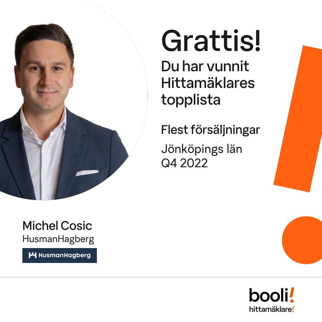 Statistik för publicerade bostäder, försäljningar och omdömen baseras på data från Booli och Hittamäklare. Statistiken för försäljningar avser inrapporterade och verifierade slutpriser från mäklare eller av Booli inhämtade och verifierade slutpriser. Statistiken för publicerade bostäder baseras på information som publicerats på Booli.se. Statistik för omdömen och rekommendationer baseras på omdömen från säljare som lämnats via Booli och Hittamäklare.