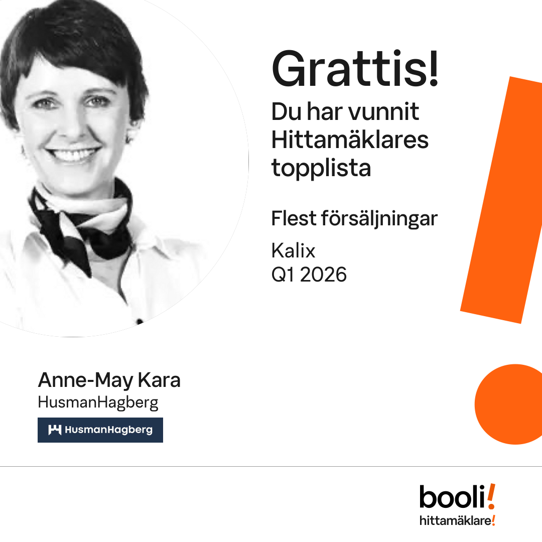Statistik för publicerade bostäder, försäljningar och omdömen baseras på data från Booli. Statistiken för försäljningar avser inrapporterade och verifierade slutpriser från mäklare eller av Booli inhämtade och verifierade slutpriser. Statistiken för publicerade bostäder baseras på information som publicerats på Booli.se. Statistik för omdömen och rekommendationer baseras på omdömen från säljare som lämnats via Booli.