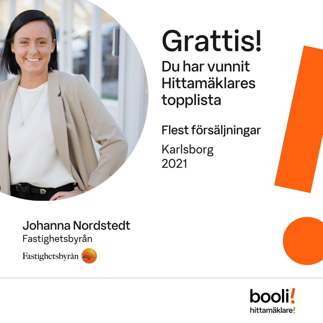 Statistik för publicerade bostäder, försäljningar och omdömen baseras på data från Booli och Hittamäklare. Statistiken för försäljningar avser inrapporterade och verifierade slutpriser från mäklare eller av Booli inhämtade och verifierade slutpriser. Statistiken för publicerade bostäder baseras på information som publicerats på Booli.se. Statistik för omdömen och rekommendationer baseras på omdömen från säljare som lämnats via Booli och Hittamäklare.