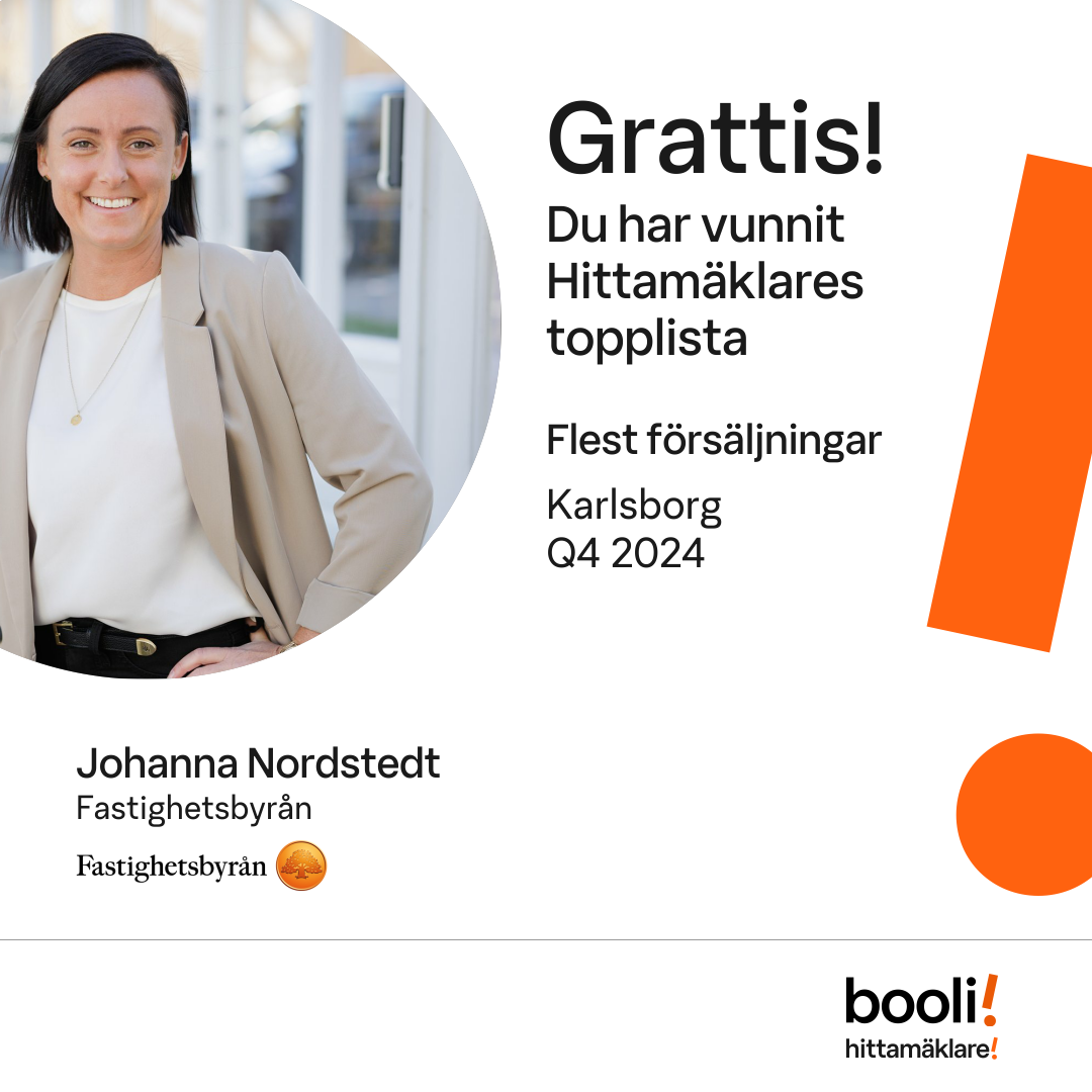 Statistik för publicerade bostäder, försäljningar och omdömen baseras på data från Booli och Hittamäklare. Statistiken för försäljningar avser inrapporterade och verifierade slutpriser från mäklare eller av Booli inhämtade och verifierade slutpriser. Statistiken för publicerade bostäder baseras på information som publicerats på Booli.se. Statistik för omdömen och rekommendationer baseras på omdömen från säljare som lämnats via Booli och Hittamäklare.