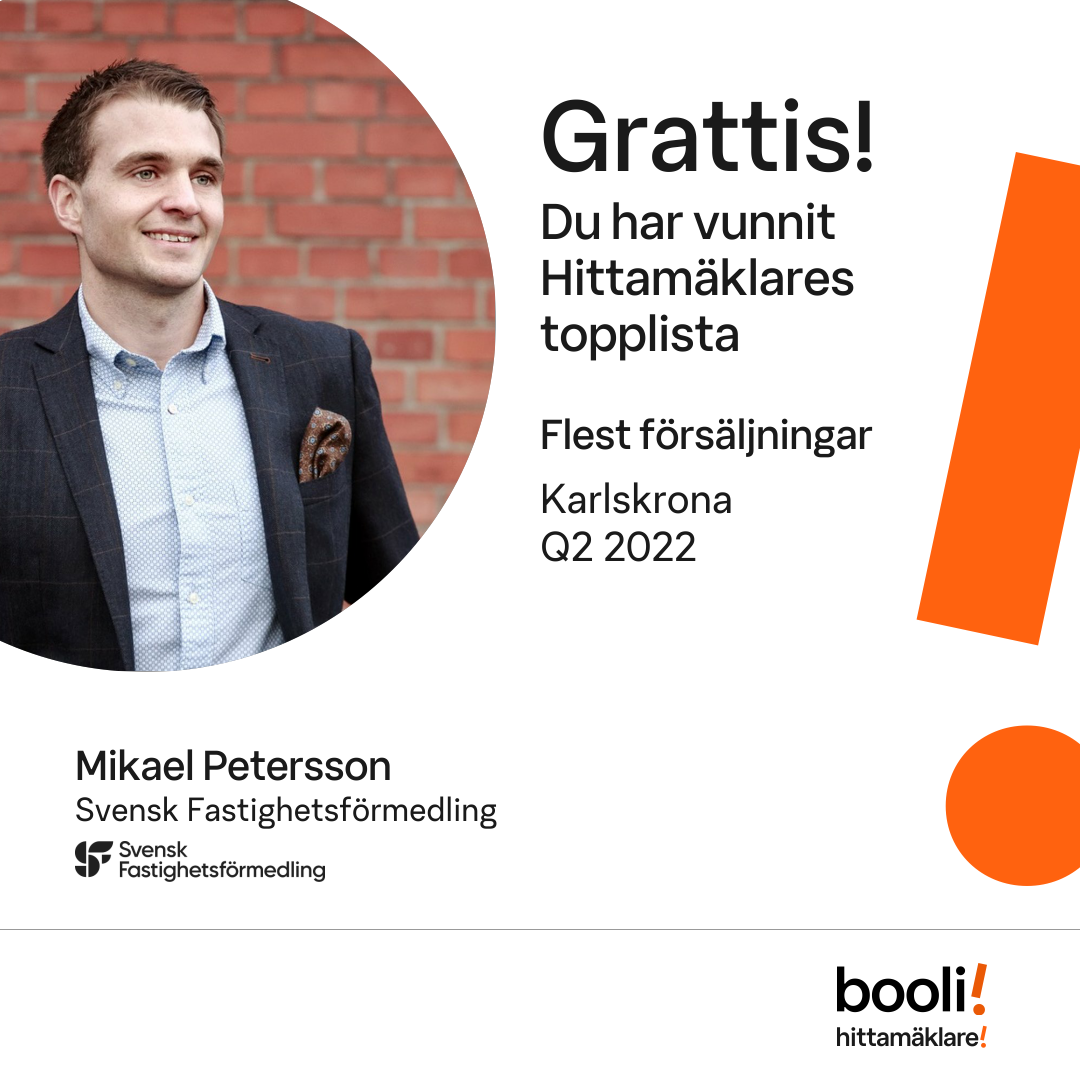 Statistik för publicerade bostäder, försäljningar och omdömen baseras på data från Booli och Hittamäklare. Statistiken för försäljningar avser inrapporterade och verifierade slutpriser från mäklare eller av Booli inhämtade och verifierade slutpriser. Statistiken för publicerade bostäder baseras på information som publicerats på Booli.se. Statistik för omdömen och rekommendationer baseras på omdömen från säljare som lämnats via Booli och Hittamäklare.