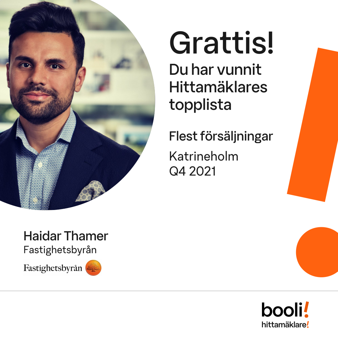Statistik för publicerade bostäder, försäljningar och omdömen baseras på data från Booli och Hittamäklare. Statistiken för försäljningar avser inrapporterade och verifierade slutpriser från mäklare eller av Booli inhämtade och verifierade slutpriser. Statistiken för publicerade bostäder baseras på information som publicerats på Booli.se. Statistik för omdömen och rekommendationer baseras på omdömen från säljare som lämnats via Booli och Hittamäklare.