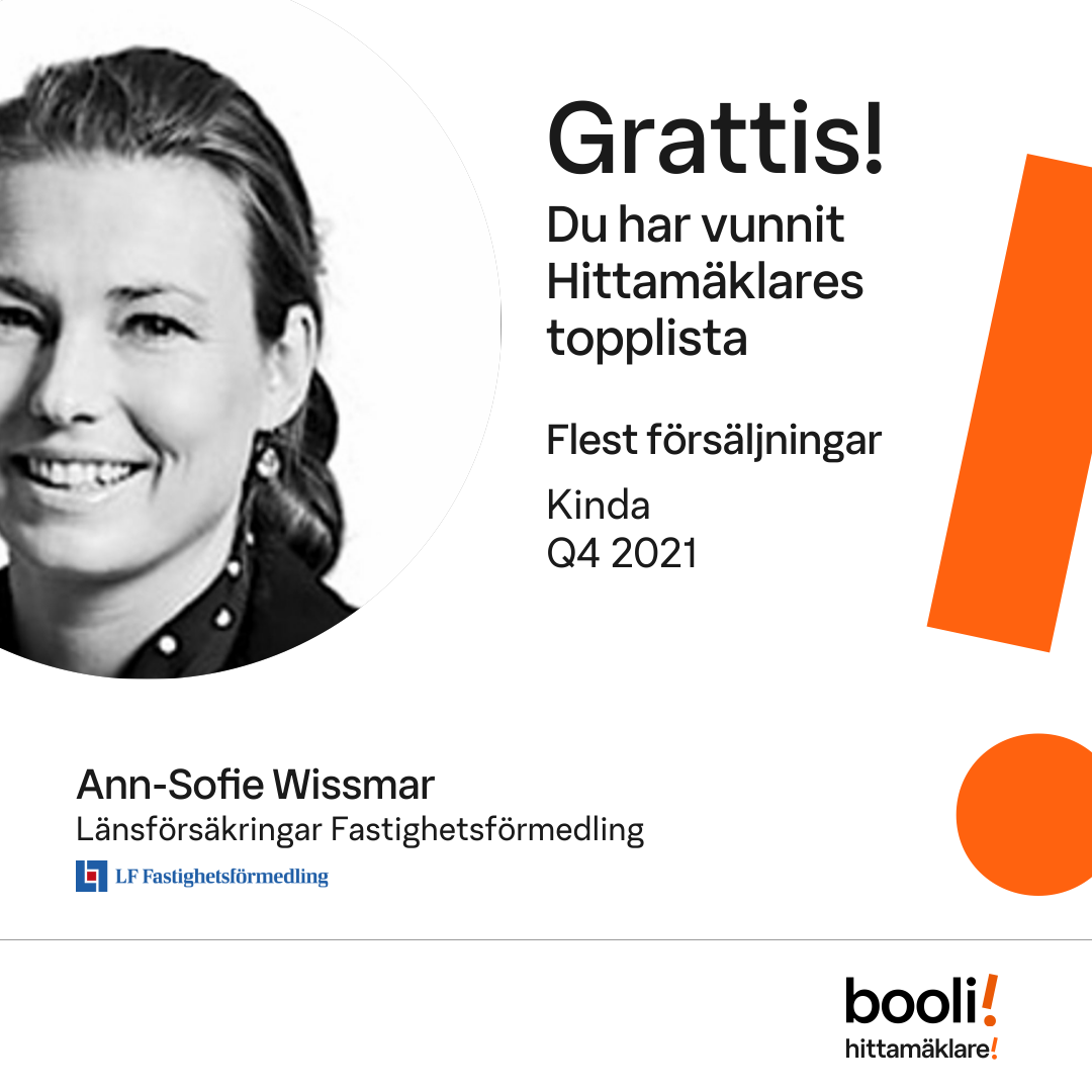 Statistik för publicerade bostäder, försäljningar och omdömen baseras på data från Booli och Hittamäklare. Statistiken för försäljningar avser inrapporterade och verifierade slutpriser från mäklare eller av Booli inhämtade och verifierade slutpriser. Statistiken för publicerade bostäder baseras på information som publicerats på Booli.se. Statistik för omdömen och rekommendationer baseras på omdömen från säljare som lämnats via Booli och Hittamäklare.