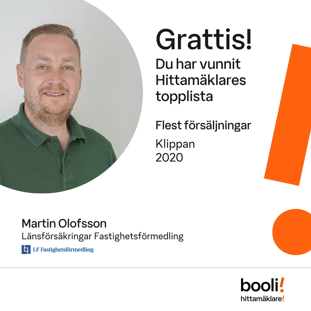 Statistik för publicerade bostäder, försäljningar och omdömen baseras på data från Booli och Hittamäklare. Statistiken för försäljningar avser inrapporterade och verifierade slutpriser från mäklare eller av Booli inhämtade och verifierade slutpriser. Statistiken för publicerade bostäder baseras på information som publicerats på Booli.se. Statistik för omdömen och rekommendationer baseras på omdömen från säljare som lämnats via Booli och Hittamäklare.