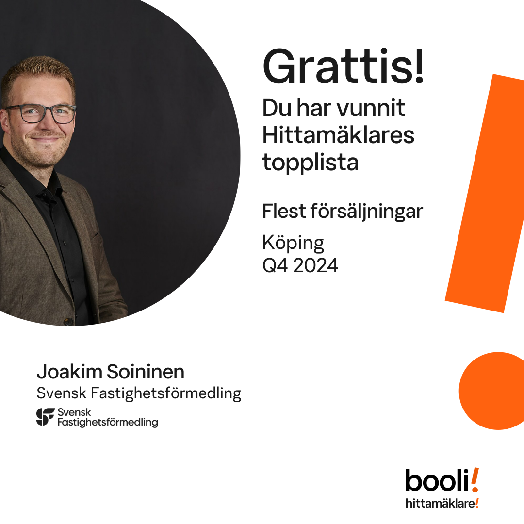 Statistik för publicerade bostäder, försäljningar och omdömen baseras på data från Booli och Hittamäklare. Statistiken för försäljningar avser inrapporterade och verifierade slutpriser från mäklare eller av Booli inhämtade och verifierade slutpriser. Statistiken för publicerade bostäder baseras på information som publicerats på Booli.se. Statistik för omdömen och rekommendationer baseras på omdömen från säljare som lämnats via Booli och Hittamäklare.