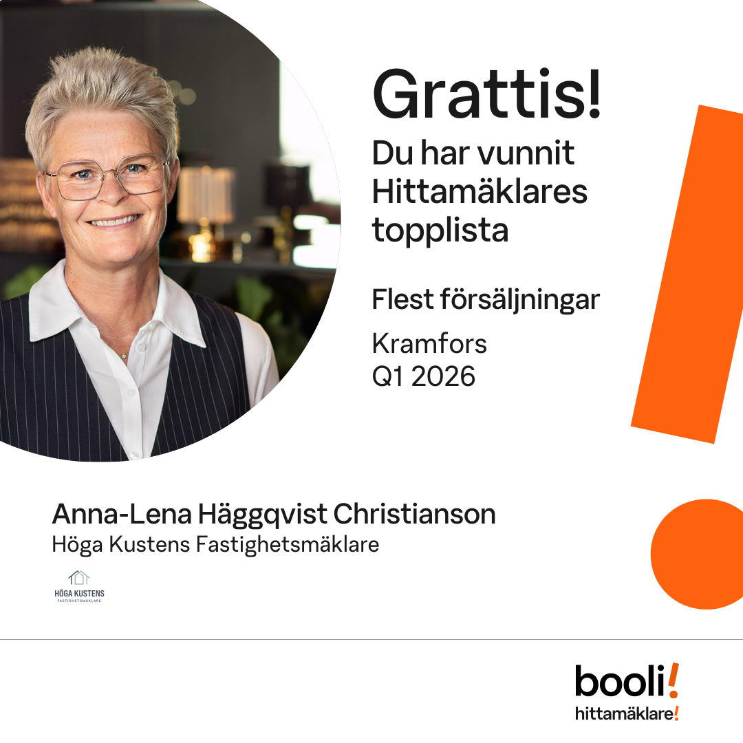 Statistik för publicerade bostäder, försäljningar och omdömen baseras på data från Booli. Statistiken för försäljningar avser inrapporterade och verifierade slutpriser från mäklare eller av Booli inhämtade och verifierade slutpriser. Statistiken för publicerade bostäder baseras på information som publicerats på Booli.se. Statistik för omdömen och rekommendationer baseras på omdömen från säljare som lämnats via Booli.