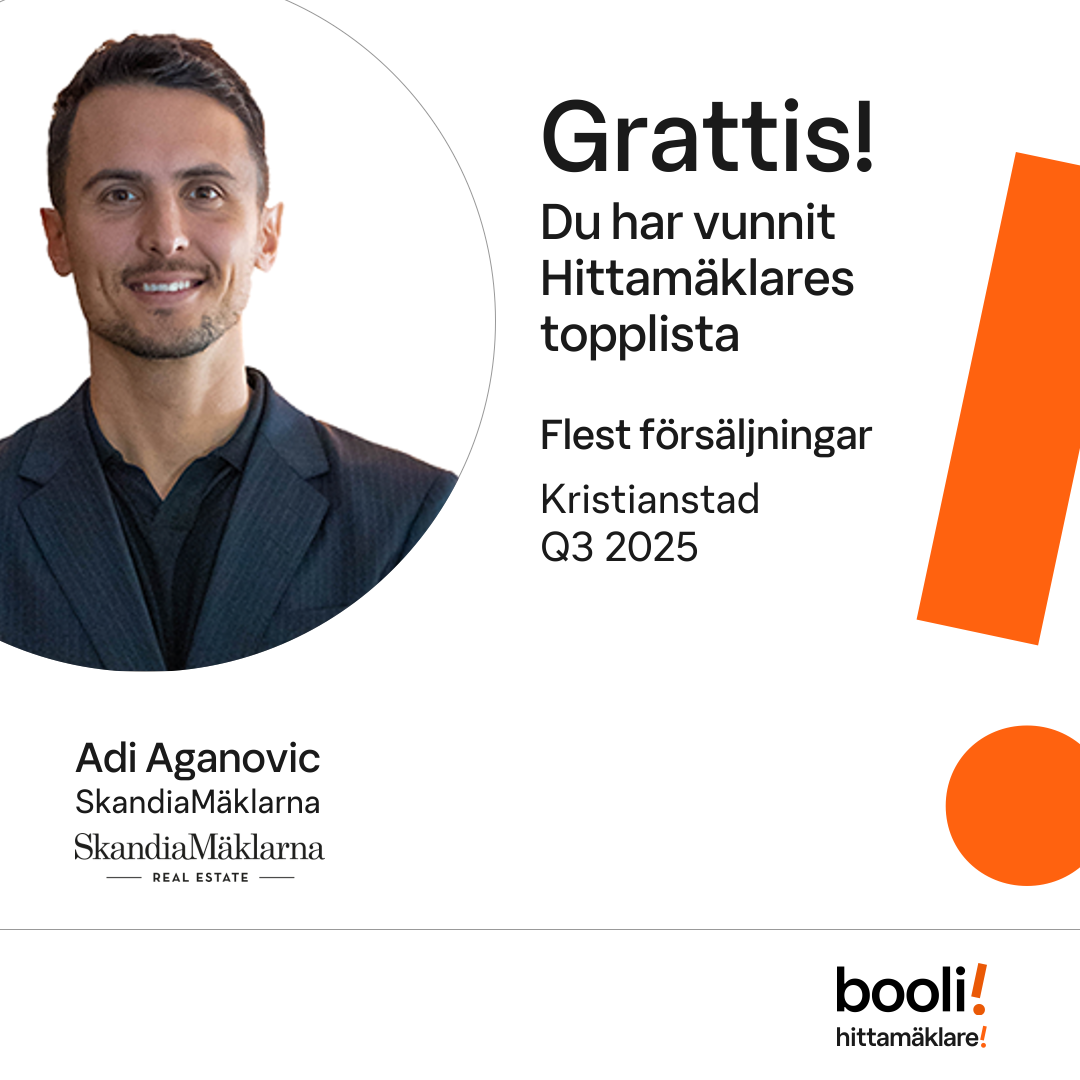 Statistik för publicerade bostäder, försäljningar och omdömen baseras på data från Booli och Hittamäklare. Statistiken för försäljningar avser inrapporterade och verifierade slutpriser från mäklare eller av Booli inhämtade och verifierade slutpriser. Statistiken för publicerade bostäder baseras på information som publicerats på Booli.se. Statistik för omdömen och rekommendationer baseras på omdömen från säljare som lämnats via Booli och Hittamäklare.