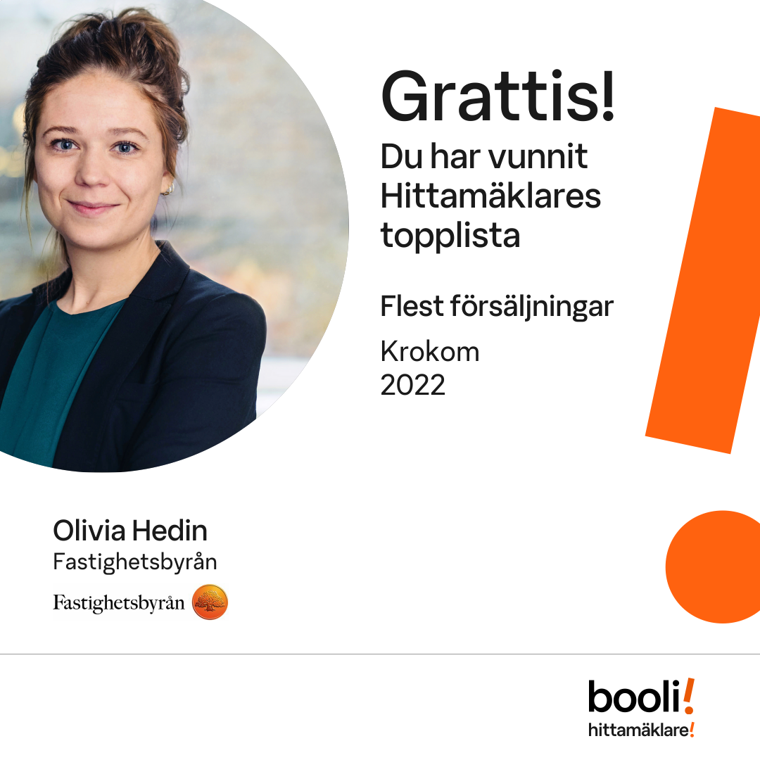 Statistik för publicerade bostäder, försäljningar och omdömen baseras på data från Booli och Hittamäklare. Statistiken för försäljningar avser inrapporterade och verifierade slutpriser från mäklare eller av Booli inhämtade och verifierade slutpriser. Statistiken för publicerade bostäder baseras på information som publicerats på Booli.se. Statistik för omdömen och rekommendationer baseras på omdömen från säljare som lämnats via Booli och Hittamäklare.