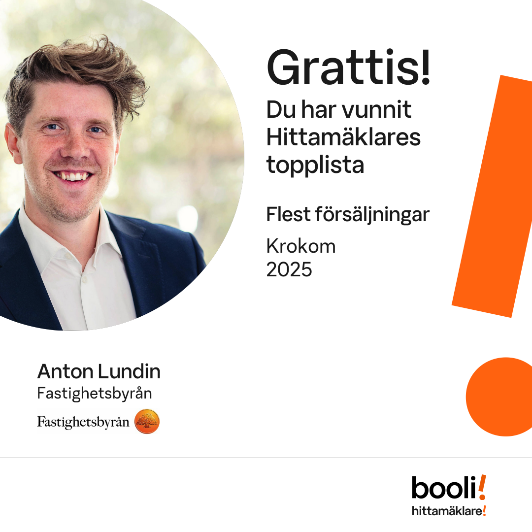 Statistik för publicerade bostäder, försäljningar och omdömen baseras på data från Booli och Hittamäklare. Statistiken för försäljningar avser inrapporterade och verifierade slutpriser från mäklare eller av Booli inhämtade och verifierade slutpriser. Statistiken för publicerade bostäder baseras på information som publicerats på Booli.se. Statistik för omdömen och rekommendationer baseras på omdömen från säljare som lämnats via Booli och Hittamäklare.