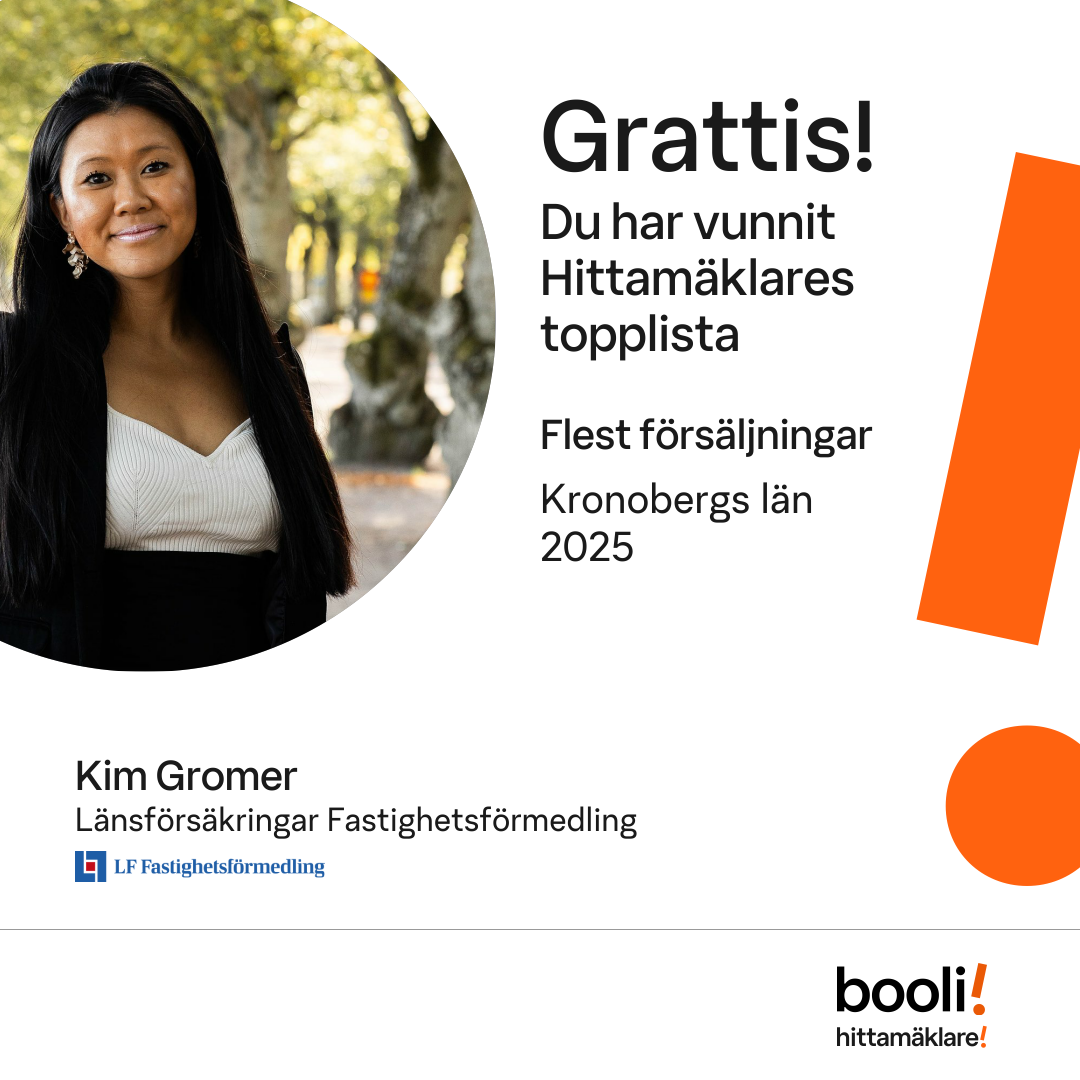 Statistik för publicerade bostäder, försäljningar och omdömen baseras på data från Booli och Hittamäklare. Statistiken för försäljningar avser inrapporterade och verifierade slutpriser från mäklare eller av Booli inhämtade och verifierade slutpriser. Statistiken för publicerade bostäder baseras på information som publicerats på Booli.se. Statistik för omdömen och rekommendationer baseras på omdömen från säljare som lämnats via Booli och Hittamäklare.