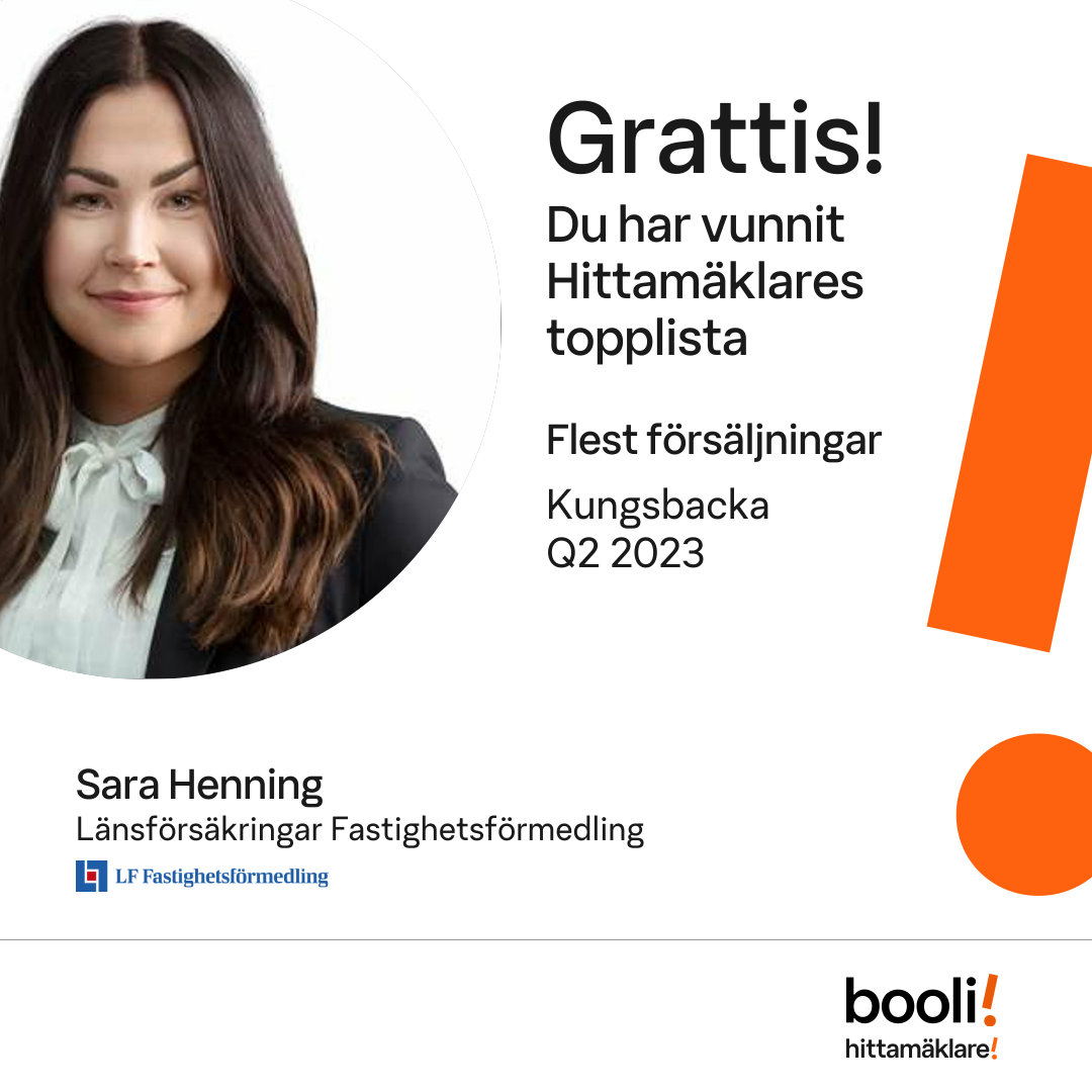 Statistik för publicerade bostäder, försäljningar och omdömen baseras på data från Booli och Hittamäklare. Statistiken för försäljningar avser inrapporterade och verifierade slutpriser från mäklare eller av Booli inhämtade och verifierade slutpriser. Statistiken för publicerade bostäder baseras på information som publicerats på Booli.se. Statistik för omdömen och rekommendationer baseras på omdömen från säljare som lämnats via Booli och Hittamäklare.