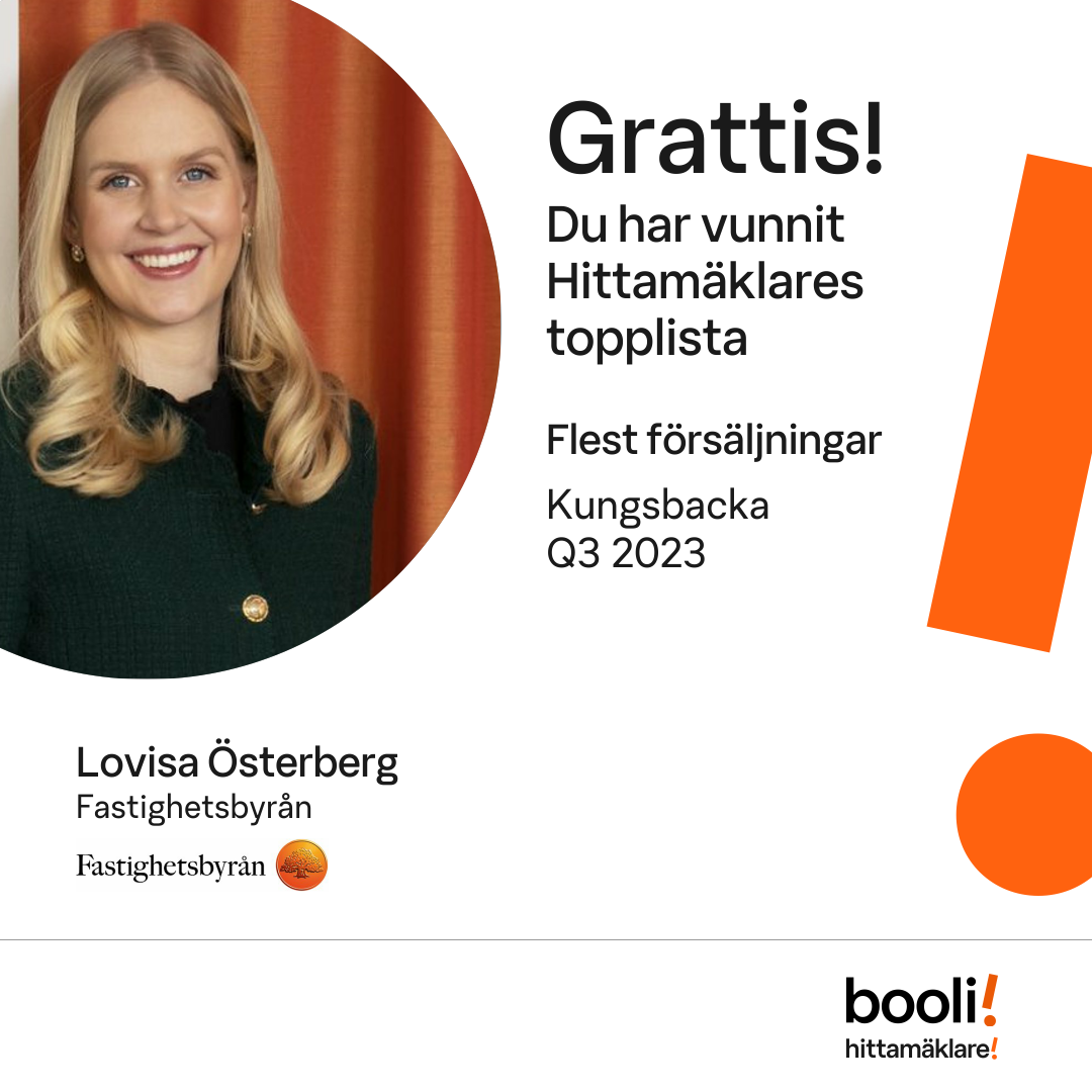 Statistik för publicerade bostäder, försäljningar och omdömen baseras på data från Booli och Hittamäklare. Statistiken för försäljningar avser inrapporterade och verifierade slutpriser från mäklare eller av Booli inhämtade och verifierade slutpriser. Statistiken för publicerade bostäder baseras på information som publicerats på Booli.se. Statistik för omdömen och rekommendationer baseras på omdömen från säljare som lämnats via Booli och Hittamäklare.