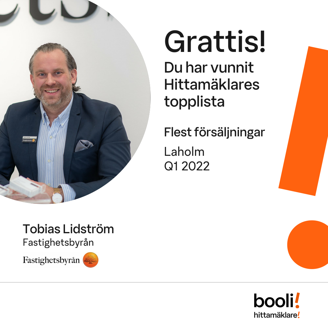 Statistik för publicerade bostäder, försäljningar och omdömen baseras på data från Booli och Hittamäklare. Statistiken för försäljningar avser inrapporterade och verifierade slutpriser från mäklare eller av Booli inhämtade och verifierade slutpriser. Statistiken för publicerade bostäder baseras på information som publicerats på Booli.se. Statistik för omdömen och rekommendationer baseras på omdömen från säljare som lämnats via Booli och Hittamäklare.