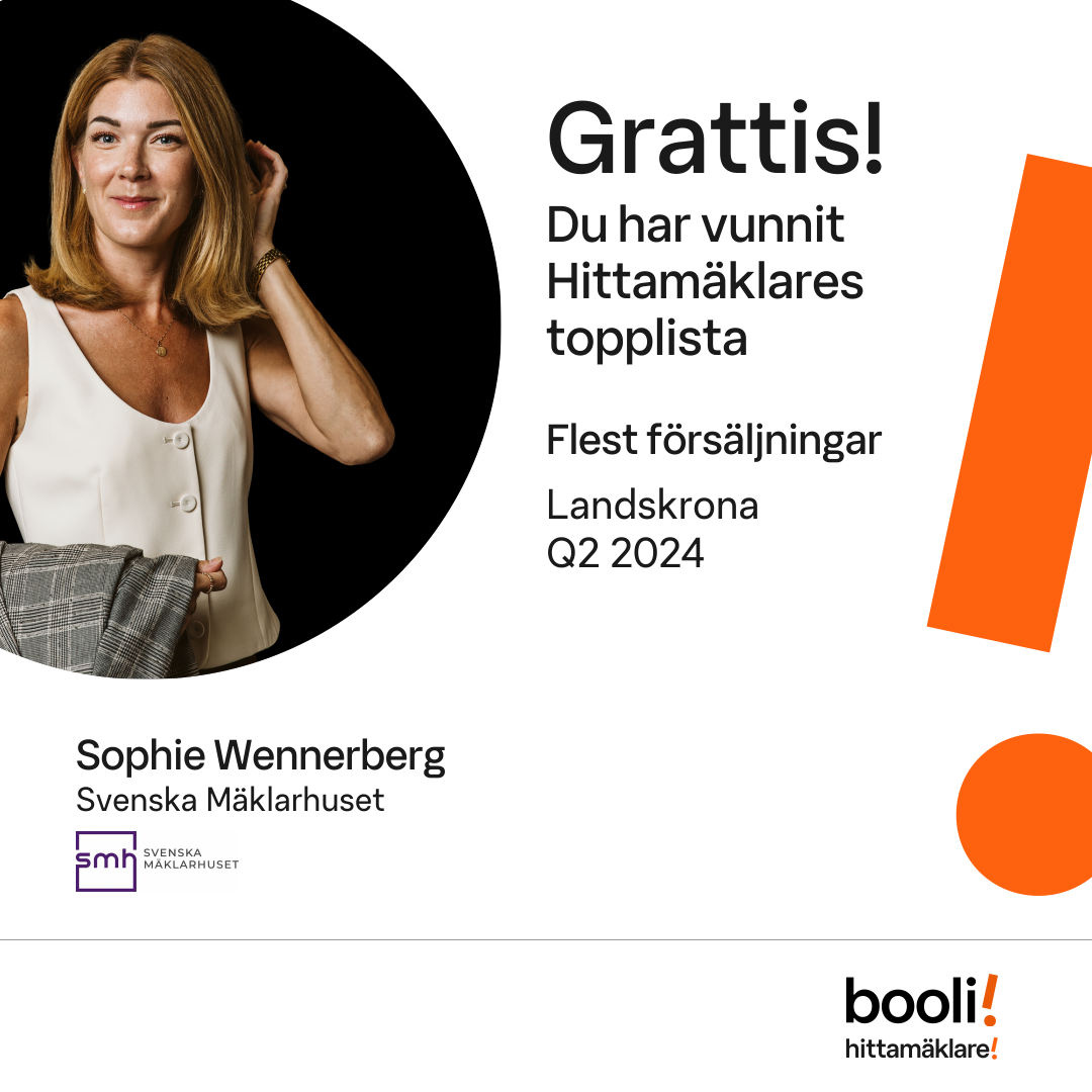 Statistik för publicerade bostäder, försäljningar och omdömen baseras på data från Booli och Hittamäklare. Statistiken för försäljningar avser inrapporterade och verifierade slutpriser från mäklare eller av Booli inhämtade och verifierade slutpriser. Statistiken för publicerade bostäder baseras på information som publicerats på Booli.se. Statistik för omdömen och rekommendationer baseras på omdömen från säljare som lämnats via Booli och Hittamäklare.