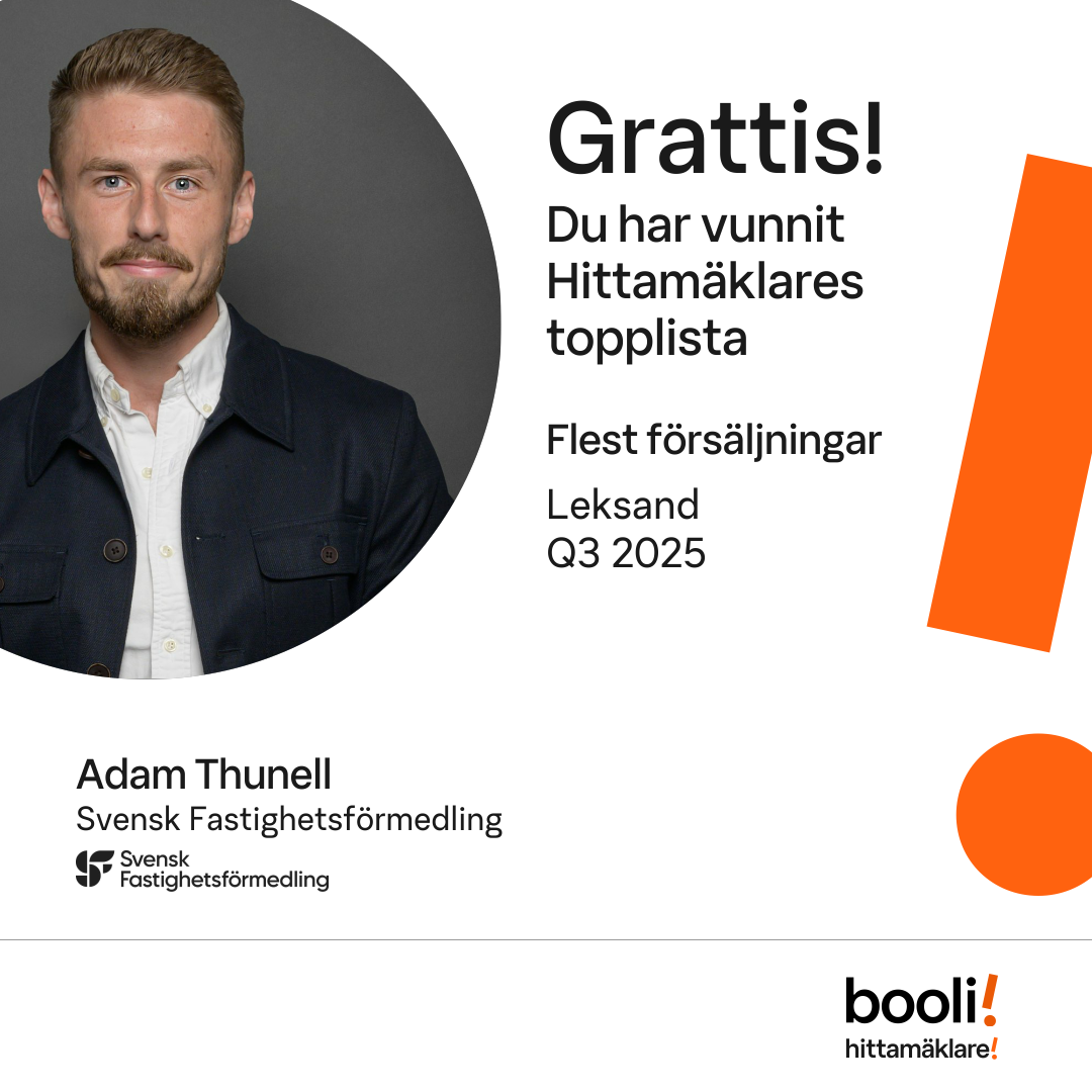 Statistik för publicerade bostäder, försäljningar och omdömen baseras på data från Booli och Hittamäklare. Statistiken för försäljningar avser inrapporterade och verifierade slutpriser från mäklare eller av Booli inhämtade och verifierade slutpriser. Statistiken för publicerade bostäder baseras på information som publicerats på Booli.se. Statistik för omdömen och rekommendationer baseras på omdömen från säljare som lämnats via Booli och Hittamäklare.