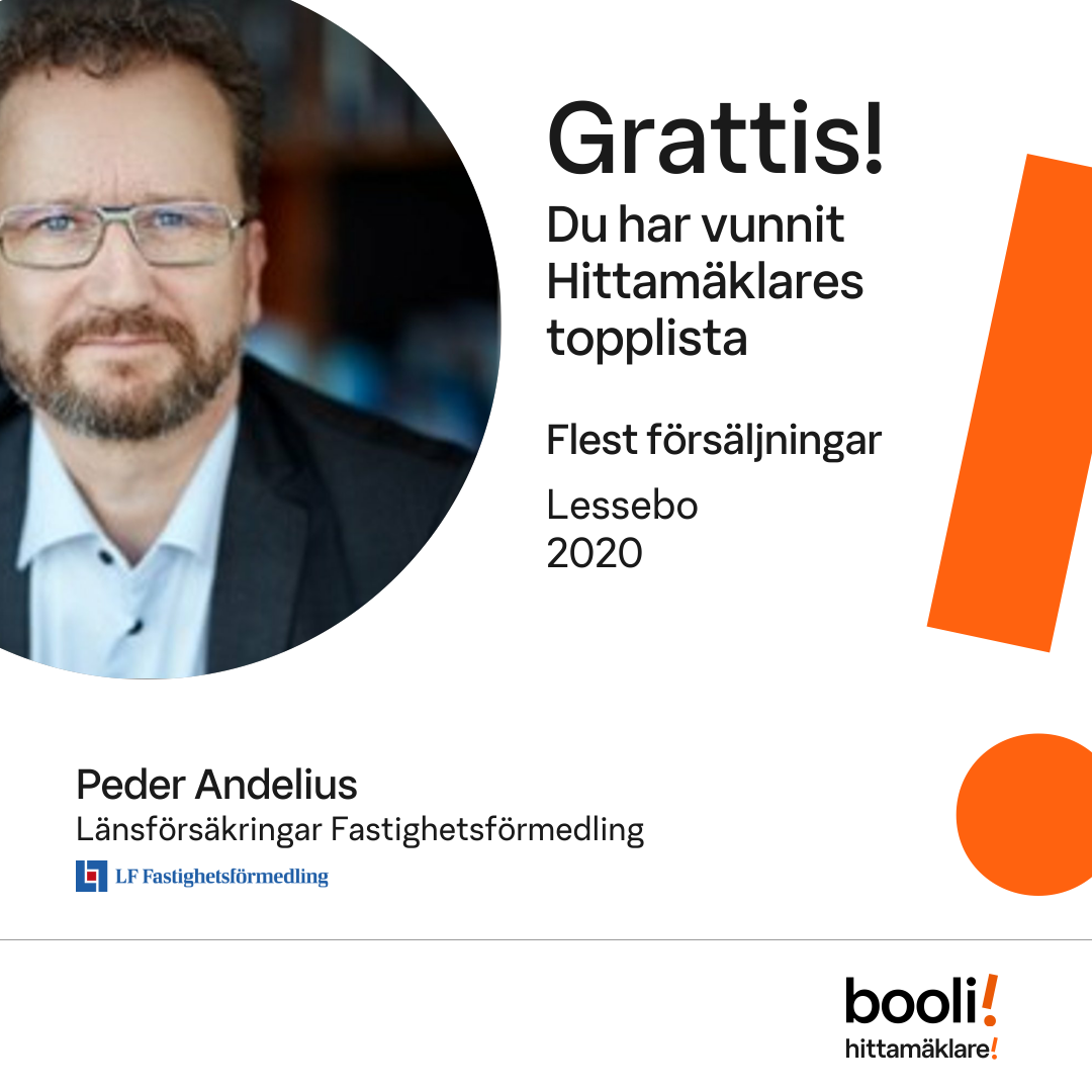Statistik för publicerade bostäder, försäljningar och omdömen baseras på data från Booli och Hittamäklare. Statistiken för försäljningar avser inrapporterade och verifierade slutpriser från mäklare eller av Booli inhämtade och verifierade slutpriser. Statistiken för publicerade bostäder baseras på information som publicerats på Booli.se. Statistik för omdömen och rekommendationer baseras på omdömen från säljare som lämnats via Booli och Hittamäklare.