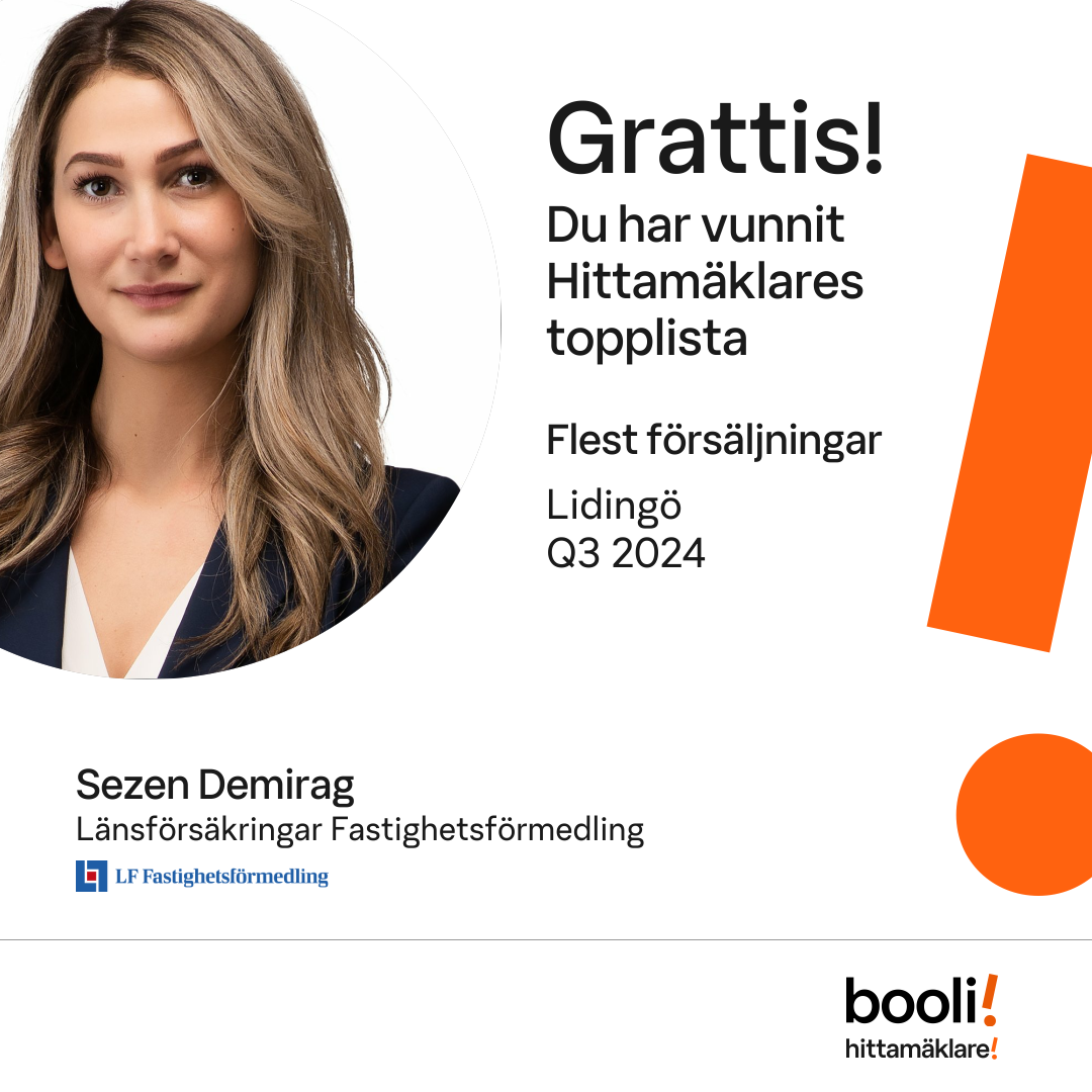 Statistik för publicerade bostäder, försäljningar och omdömen baseras på data från Booli och Hittamäklare. Statistiken för försäljningar avser inrapporterade och verifierade slutpriser från mäklare eller av Booli inhämtade och verifierade slutpriser. Statistiken för publicerade bostäder baseras på information som publicerats på Booli.se. Statistik för omdömen och rekommendationer baseras på omdömen från säljare som lämnats via Booli och Hittamäklare.