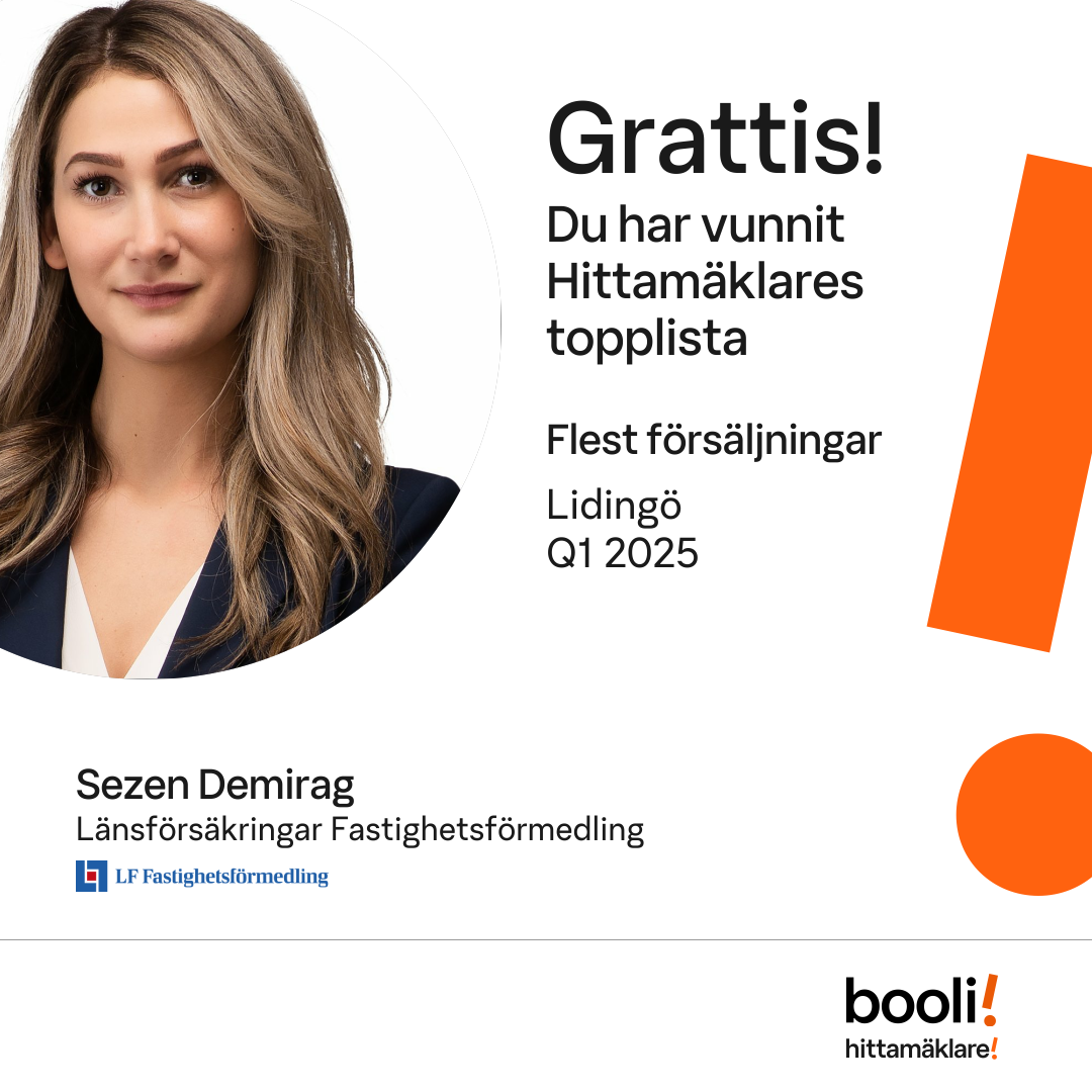 Statistik för publicerade bostäder, försäljningar och omdömen baseras på data från Booli och Hittamäklare. Statistiken för försäljningar avser inrapporterade och verifierade slutpriser från mäklare eller av Booli inhämtade och verifierade slutpriser. Statistiken för publicerade bostäder baseras på information som publicerats på Booli.se. Statistik för omdömen och rekommendationer baseras på omdömen från säljare som lämnats via Booli och Hittamäklare.