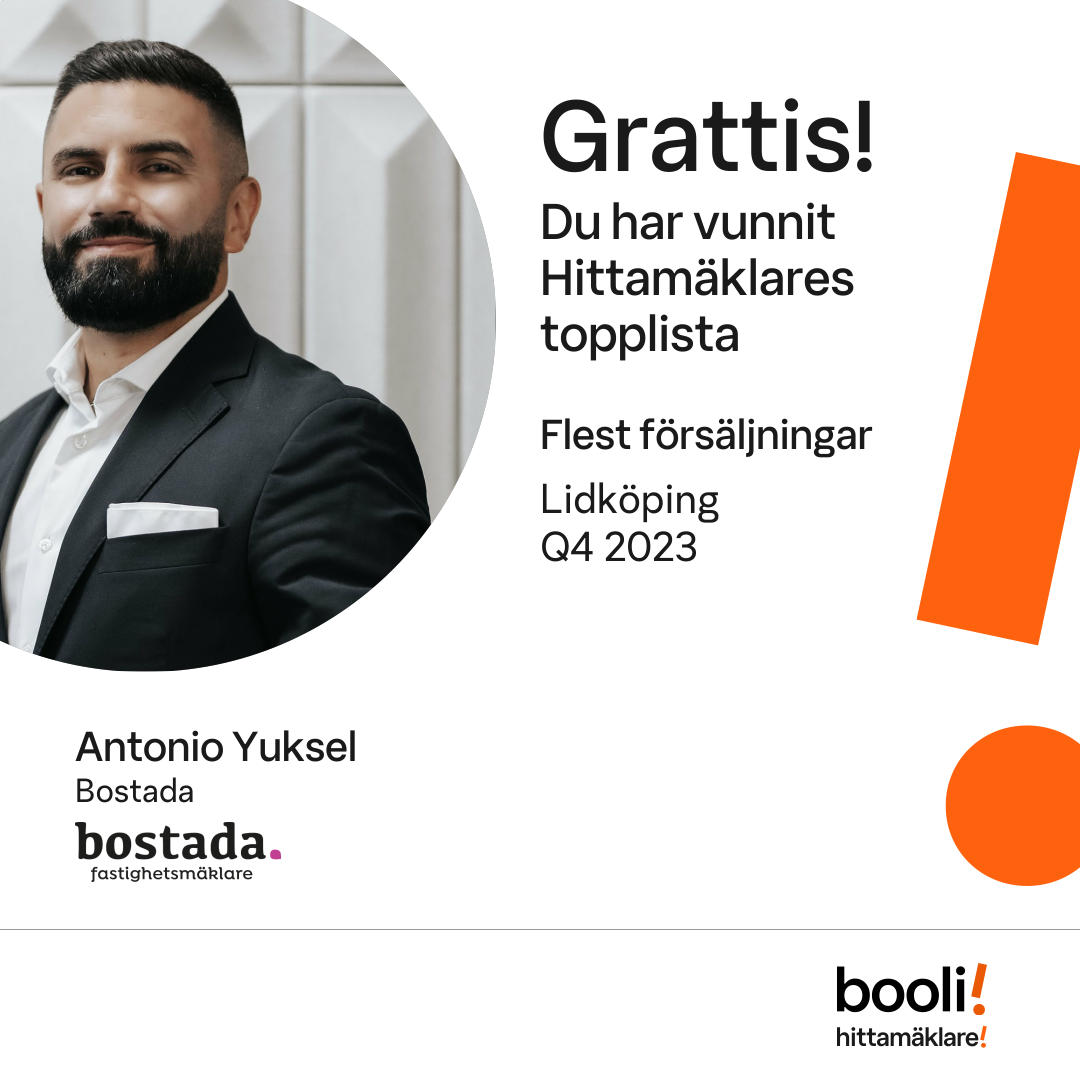 Statistik för publicerade bostäder, försäljningar och omdömen baseras på data från Booli och Hittamäklare. Statistiken för försäljningar avser inrapporterade och verifierade slutpriser från mäklare eller av Booli inhämtade och verifierade slutpriser. Statistiken för publicerade bostäder baseras på information som publicerats på Booli.se. Statistik för omdömen och rekommendationer baseras på omdömen från säljare som lämnats via Booli och Hittamäklare.