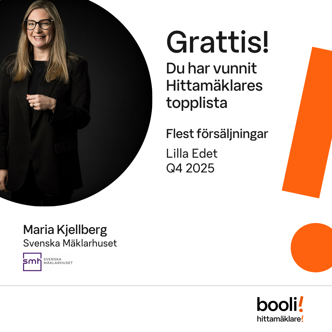Statistik för publicerade bostäder, försäljningar och omdömen baseras på data från Booli och Hittamäklare. Statistiken för försäljningar avser inrapporterade och verifierade slutpriser från mäklare eller av Booli inhämtade och verifierade slutpriser. Statistiken för publicerade bostäder baseras på information som publicerats på Booli.se. Statistik för omdömen och rekommendationer baseras på omdömen från säljare som lämnats via Booli och Hittamäklare.