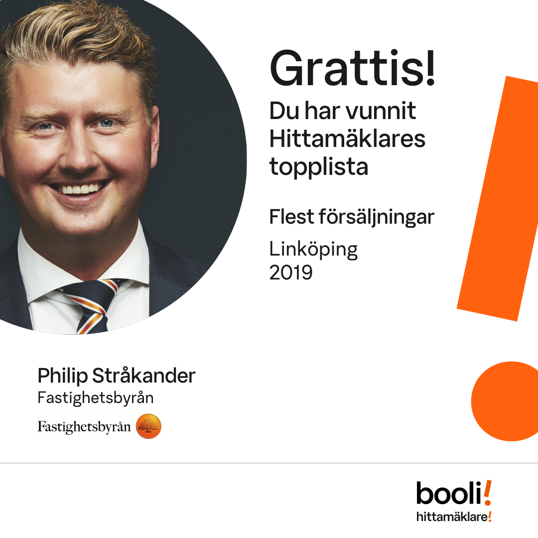Statistik för publicerade bostäder, försäljningar och omdömen baseras på data från Booli och Hittamäklare. Statistiken för försäljningar avser inrapporterade och verifierade slutpriser från mäklare eller av Booli inhämtade och verifierade slutpriser. Statistiken för publicerade bostäder baseras på information som publicerats på Booli.se. Statistik för omdömen och rekommendationer baseras på omdömen från säljare som lämnats via Booli och Hittamäklare.