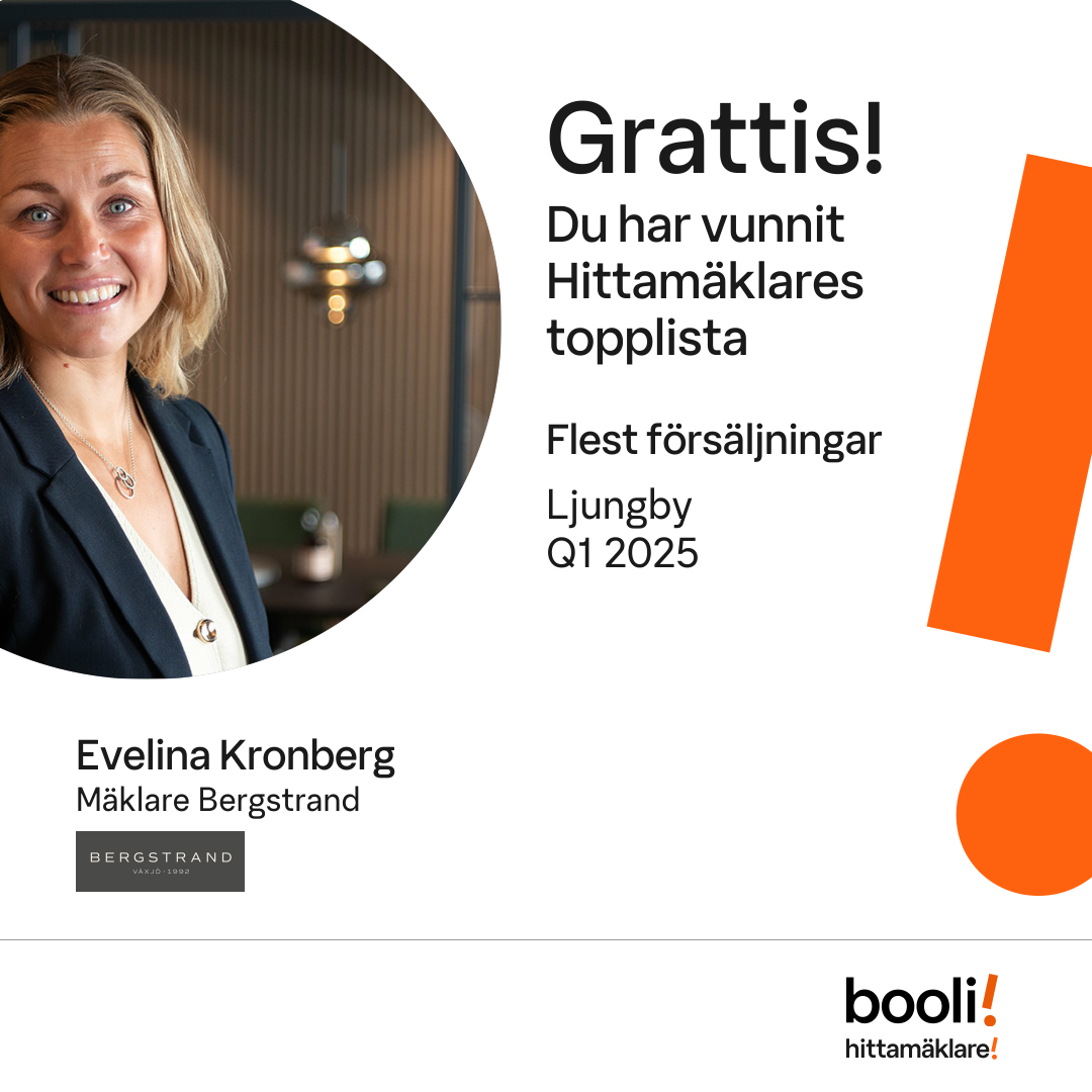 Statistik för publicerade bostäder, försäljningar och omdömen baseras på data från Booli och Hittamäklare. Statistiken för försäljningar avser inrapporterade och verifierade slutpriser från mäklare eller av Booli inhämtade och verifierade slutpriser. Statistiken för publicerade bostäder baseras på information som publicerats på Booli.se. Statistik för omdömen och rekommendationer baseras på omdömen från säljare som lämnats via Booli och Hittamäklare.