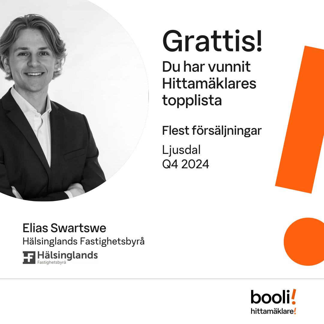 Statistik för publicerade bostäder, försäljningar och omdömen baseras på data från Booli. Statistiken för försäljningar avser inrapporterade och verifierade slutpriser från mäklare eller av Booli inhämtade och verifierade slutpriser. Statistiken för publicerade bostäder baseras på information som publicerats på Booli.se. Statistik för omdömen och rekommendationer baseras på omdömen från säljare som lämnats via Booli.