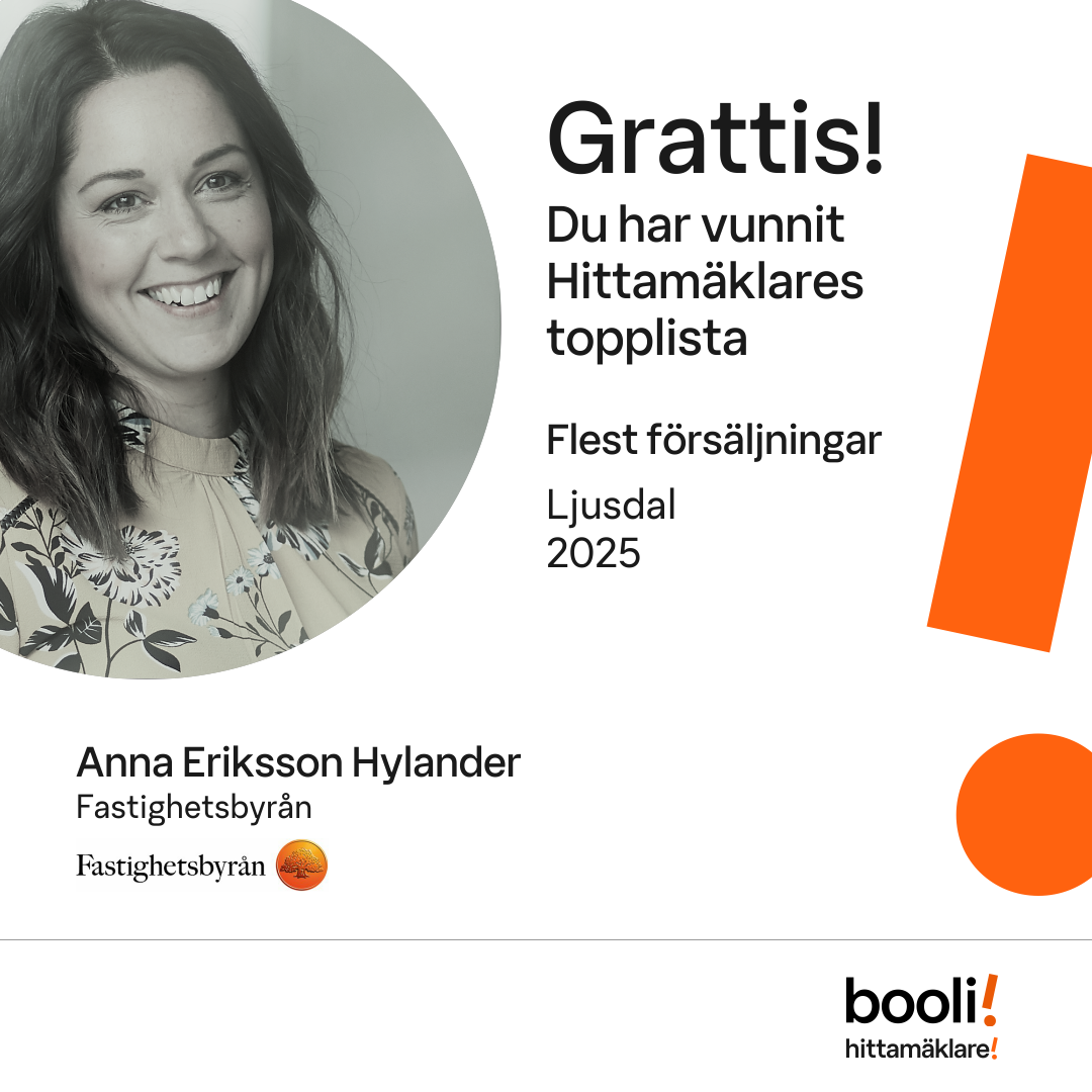 Statistik för publicerade bostäder, försäljningar och omdömen baseras på data från Booli och Hittamäklare. Statistiken för försäljningar avser inrapporterade och verifierade slutpriser från mäklare eller av Booli inhämtade och verifierade slutpriser. Statistiken för publicerade bostäder baseras på information som publicerats på Booli.se. Statistik för omdömen och rekommendationer baseras på omdömen från säljare som lämnats via Booli och Hittamäklare.