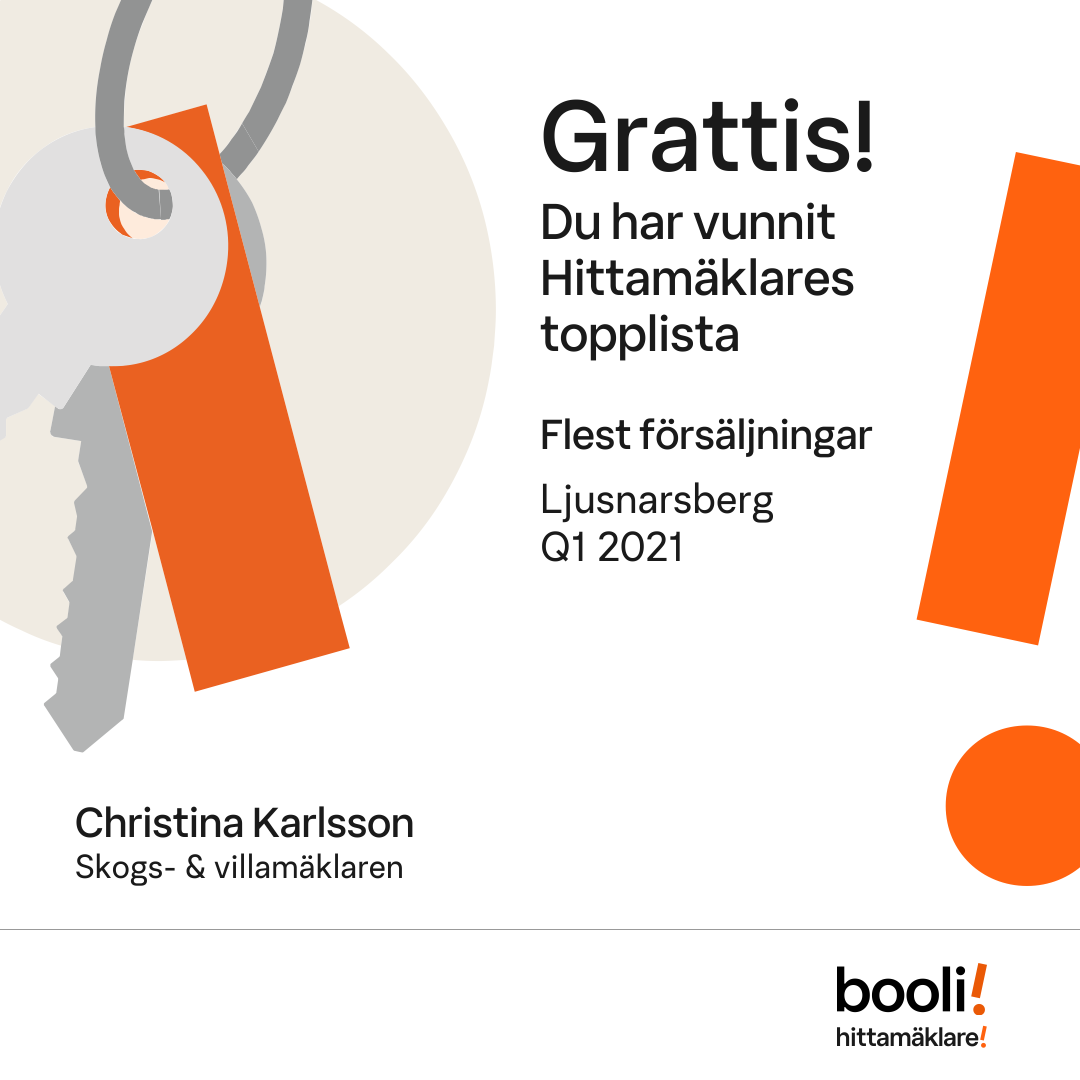 Statistik för publicerade bostäder, försäljningar och omdömen baseras på data från Booli och Hittamäklare. Statistiken för försäljningar avser inrapporterade och verifierade slutpriser från mäklare eller av Booli inhämtade och verifierade slutpriser. Statistiken för publicerade bostäder baseras på information som publicerats på Booli.se. Statistik för omdömen och rekommendationer baseras på omdömen från säljare som lämnats via Booli och Hittamäklare.