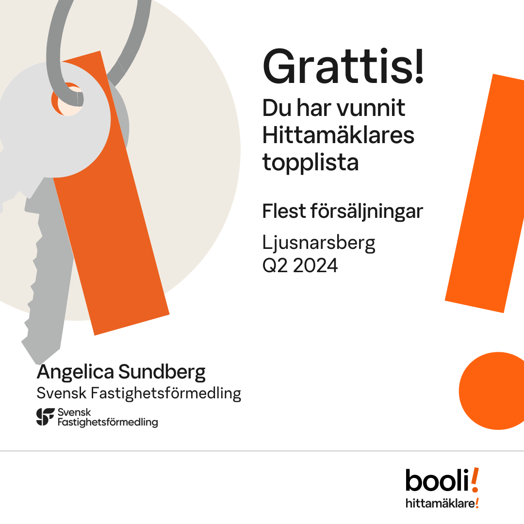 Statistik för publicerade bostäder, försäljningar och omdömen baseras på data från Booli och Hittamäklare. Statistiken för försäljningar avser inrapporterade och verifierade slutpriser från mäklare eller av Booli inhämtade och verifierade slutpriser. Statistiken för publicerade bostäder baseras på information som publicerats på Booli.se. Statistik för omdömen och rekommendationer baseras på omdömen från säljare som lämnats via Booli och Hittamäklare.